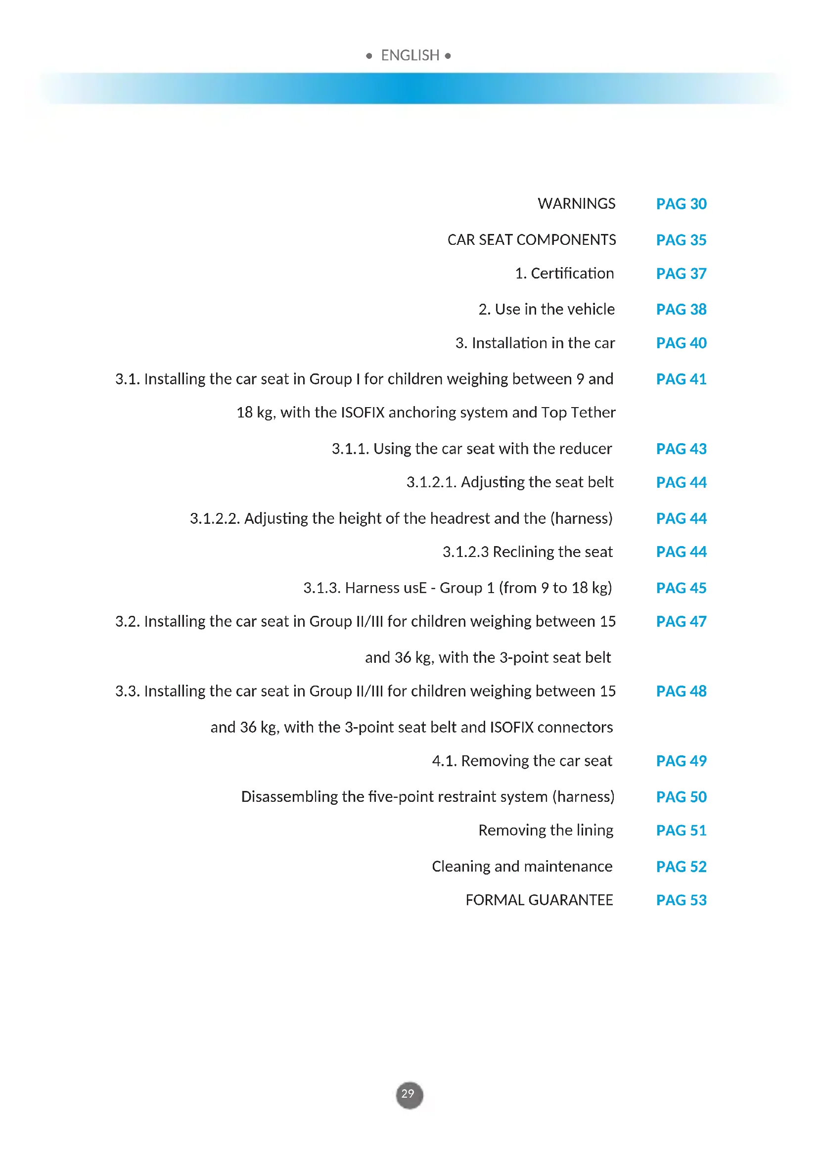 3.2. Installing the car seat in Group II/III for children weighing between 15 and 36 kg, with the 3-point seat belt 3.3. Installing the car seat in Group II/III for children weighing between 15 and 36 kg, with the 3-point seat belt and ISOFIX connectors 4.1. Removing the car seat Disassembling the ve-point restraint system (harness) Removing the lining Cleaning and maintenance