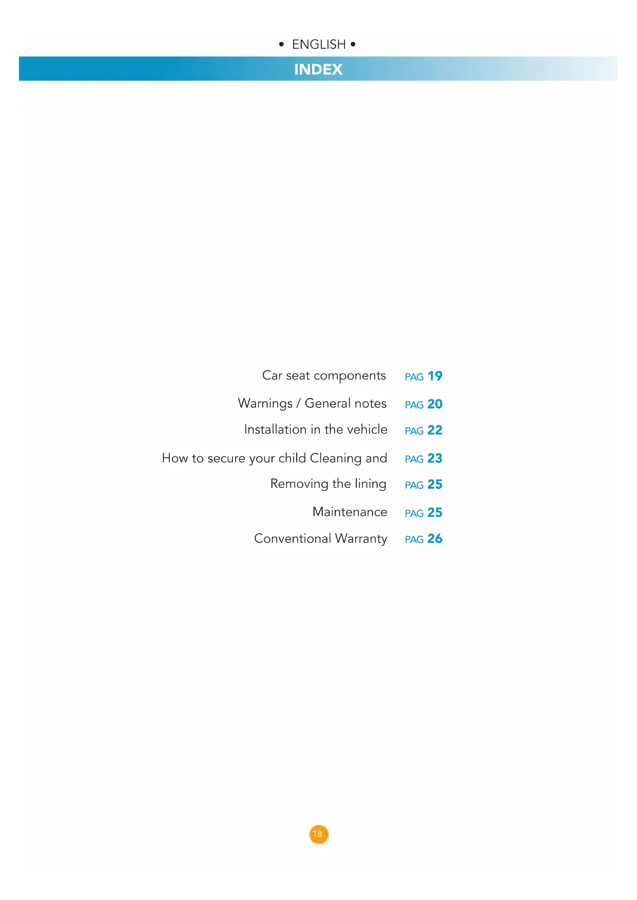 PAG 19 PAG 20 PAG 22 PAG 23 PAG 25 PAG 25 PAG 26 Car seat components Warnings / General notes Installation in the vehicle How to secure your child Cleaning and Removing the lining Maintenance Conventional Warranty