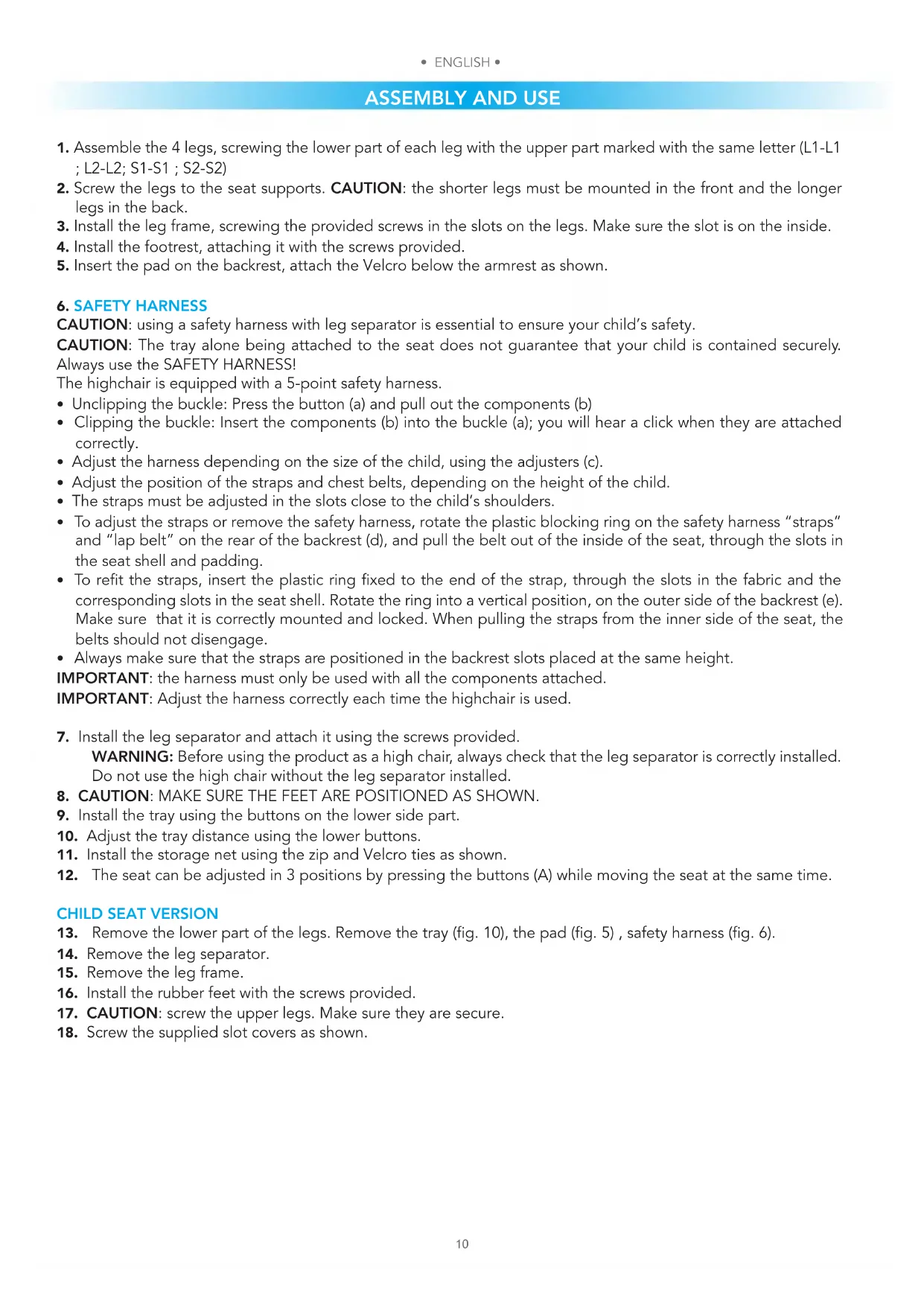 CAUTION: using a safety harness with leg separator is essential to ensure your child’s safety. CAUTION: The tray alone being attached to the seat does not guarantee that your child is contained securely. Always use the SAFETY HARNESS! The highchair is equipped with a 5-point safety harness.