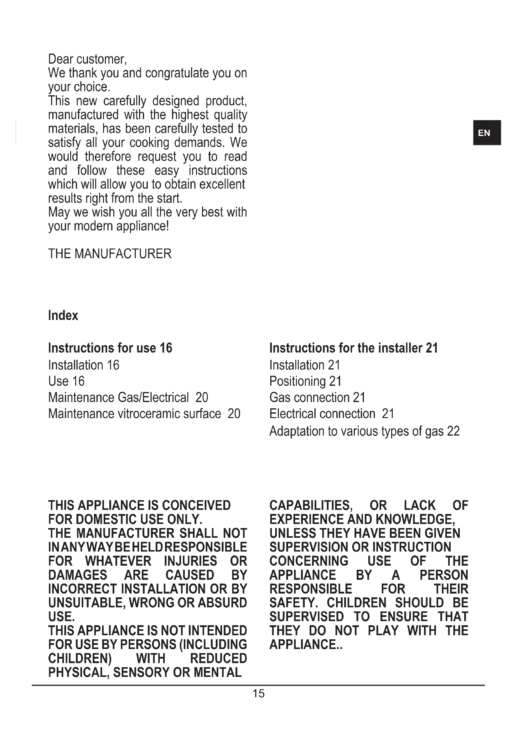 Dear customer, We thank you and congratulate you on your choice. This new carefully designed product, manufactured with the highest quality materials, has been carefully tested to satisfy all your cooking demands. We would therefore request you to read and follow these easy instructions which will allow you to obtain excellent results right from the start. May we wish you all the very best with your modern appliance! THE MANUFACTURER Index Instructions for use 16 Installation 16 Use 16 Maintenance Gas/Electrical 20 Maintenance vitroceramic surface 20 Instructions for the installer 21 Installation 21 Positioning 21 Gas connection 21 Electrical connection 21 Adaptation to various types of gas 22