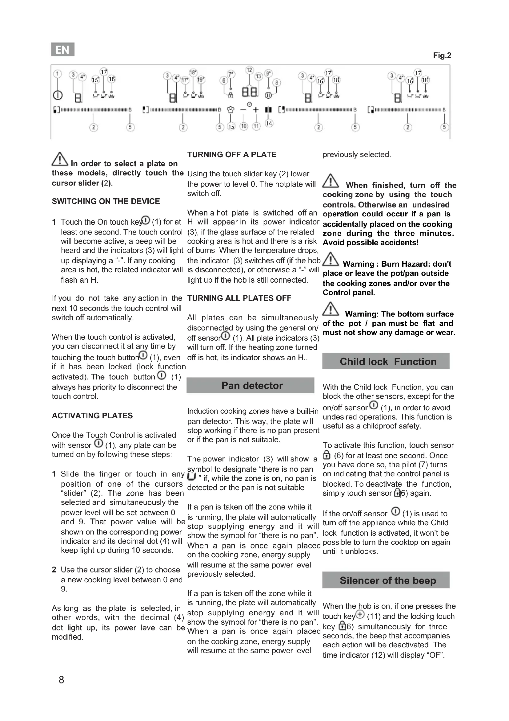 of the pot / pan must be at and must not show any damage or wear. Child lock Function With the Child lock Function, you can block the other sensors, except for the on/o sensor (1), in order to avoid undesired operations. This function is useful as a childproof safety. To activate this function, touch sensor (6) for at least one second. Once you have done so, the pilot (7) turns on indicating that the control panel is blocked. To deactivate the function, simply touch sensor (6) again. If the on/o sensor (1) is used to turn o the appliance while the Child lock function is activated, it won’t be possible to turn the cooktop on again until it unblocks. Silencer of the beep When the hob is on, if one presses the touch key (11) and the locking touch key (6) simultaneously for three seconds, the beep that accompanies each action will be deactivated. The time indicator (12) will display “OF”. Fig.2