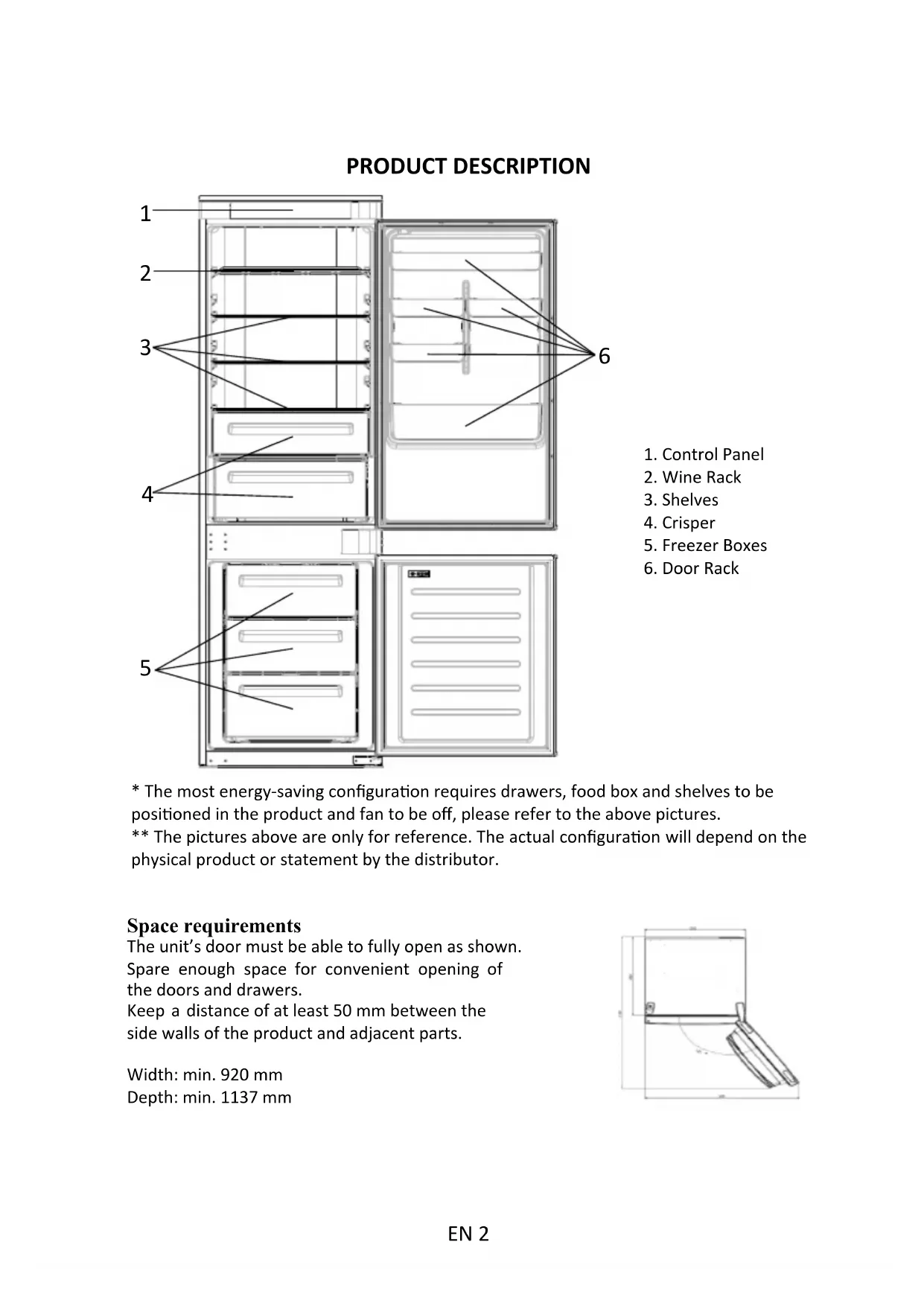- The most energy-saving configuraon requires drawers, food box and shelves to be posioned in the product and fan to be off, please refer to the above pictures. ** The pictures above are only for reference. The actual configuraon will depend on the physical product or statement by the distributor.Space requirements The unit’s door must be able to fully open as shown. Spare enough space for convenient opening of the doors and drawers. Keep a distance of at least 50 mm between the side walls of the product and adjacent parts. Width: min. 920 mmDepth: min. 1137 mm