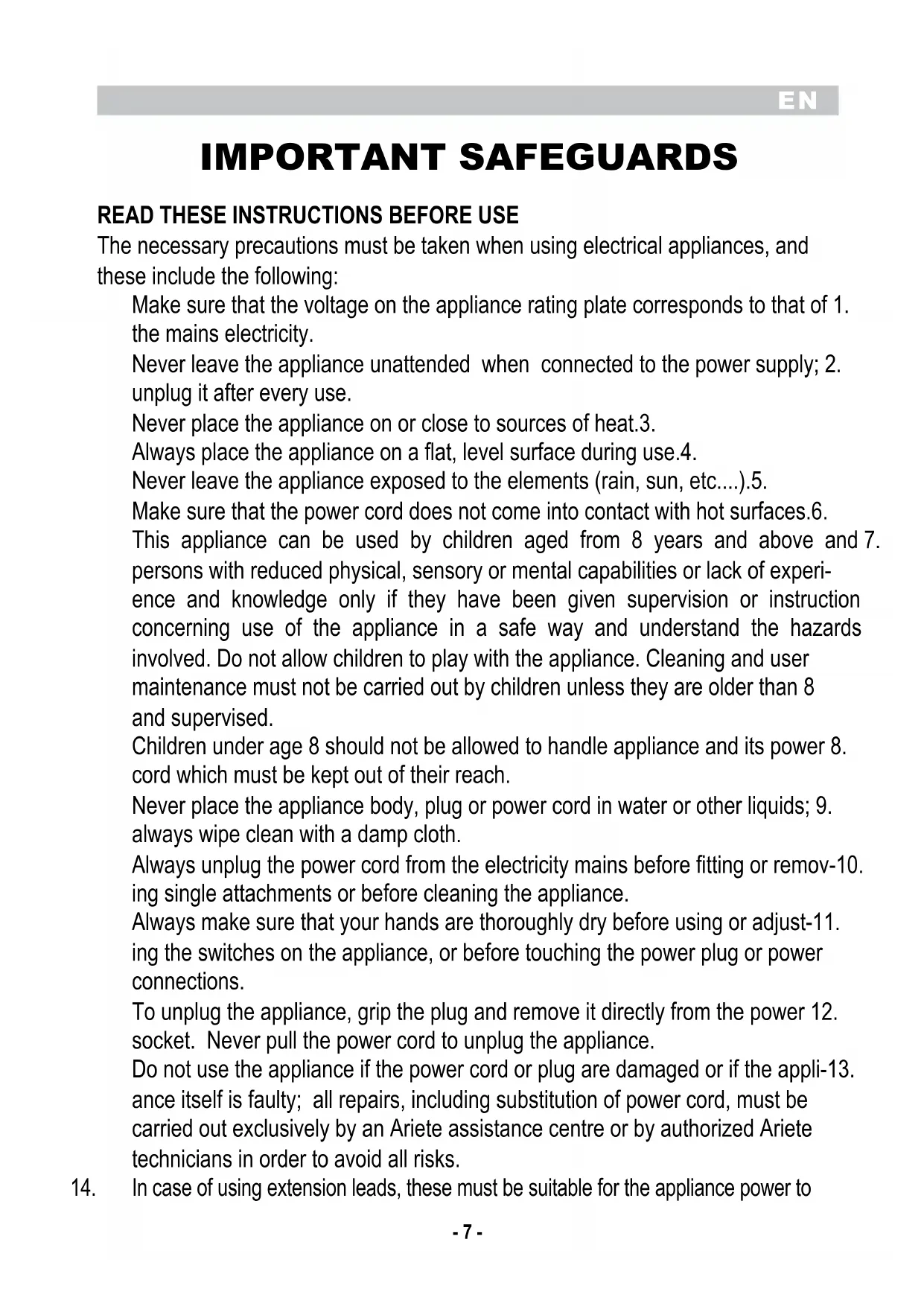 The necessary precautions must be taken when using electrical appliances, and these include the following: Make sure that the voltage on the appliance rating plate corresponds to that of 1. the mains electricity. Never leave the appliance unattended when connected to the power supply; 2. unplug it after every use. Never place the appliance on or close to sources of heat.3. Always place the appliance on a flat, level surface during use.4. Never leave the appliance exposed to the elements (rain, sun, etc....).5. Make sure that the power cord does not come into contact with hot surfaces.6. This appliance can be used by children aged from 8 years and above and 7. persons with reduced physical, sensory or mental capabilities or lack of experi- ence and knowledge only if they have been given supervision or instruction concerning use of the appliance in a safe way and understand the hazards involved. Do not allow children to play with the appliance. Cleaning and user maintenance must not be carried out by children unless they are older than 8 and supervised. Children under age 8 should not be allowed to handle appliance and its power 8. cord which must be kept out of their reach. Never place the appliance body, plug or power cord in water or other liquids; 9. always wipe clean with a damp cloth. Always unplug the power cord from the electricity mains before fitting or remov-10. ing single attachments or before cleaning the appliance. Always make sure that your hands are thoroughly dry before using or adjust-11. ing the switches on the appliance, or before touching the power plug or power connections. To unplug the appliance, grip the plug and remove it directly from the power 12. socket. Never pull the power cord to unplug the appliance. Do not use the appliance if the power cord or plug are damaged or if the appli-13. ance itself is faulty; all repairs, including substitution of power cord, must be carried out exclusively by an Ariete assistance centre or by authorized Ariete technicians in order to avoid all risks. In case of using extension leads, these must be suitable for the appliance power to 14.EN