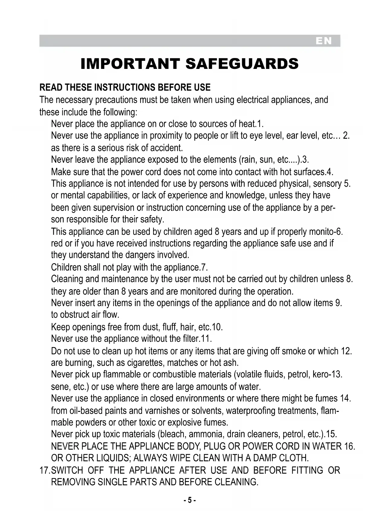The necessary precautions must be taken when using electrical appliances, and these include the following: Never place the appliance on or close to sources of heat.1. Never use the appliance in proximity to people or lift to eye level, ear level, etc… 2. as there is a serious risk of accident. Never leave the appliance exposed to the elements (rain, sun, etc....).3. Make sure that the power cord does not come into contact with hot surfaces.4. This appliance is not intended for use by persons with reduced physical, sensory 5. or mental capabilities, or lack of experience and knowledge, unless they have been given supervision or instruction concerning use of the appliance by a per- son responsible for their safety. This appliance can be used by children aged 8 years and up if properly monito-6. red or if you have received instructions regarding the appliance safe use and if they understand the dangers involved. Children shall not play with the appliance.7. Cleaning and maintenance by the user must not be carried out by children unless 8. they are older than 8 years and are monitored during the operation. Never insert any items in the openings of the appliance and do not allow items 9. to obstruct air flow. Keep openings free from dust, fluff, hair, etc.10. Never use the appliance without the filter.11. Do not use to clean up hot items or any items that are giving off smoke or which 12. are burning, such as cigarettes, matches or hot ash. Never pick up flammable or combustible materials (volatile fluids, petrol, kero-13. sene, etc.) or use where there are large amounts of water. Never use the appliance in closed environments or where there might be fumes 14. from oil-based paints and varnishes or solvents, waterproofing treatments, flam- mable powders or other toxic or explosive fumes. Never pick up toxic materials (bleach, ammonia, drain cleaners, petrol, etc.).15. NEVER PLACE THE APPLIANCE BODY, PLUG OR POWER CORD IN WATER 16. OR OTHER LIQUIDS; ALWAYS WIPE CLEAN WITH A DAMP CLOTH. SWITCH OFF THE APPLIANCE AFTER USE AND BEFORE FITTING OR 17. REMOVING SINGLE PARTS AND BEFORE CLEANING.EN