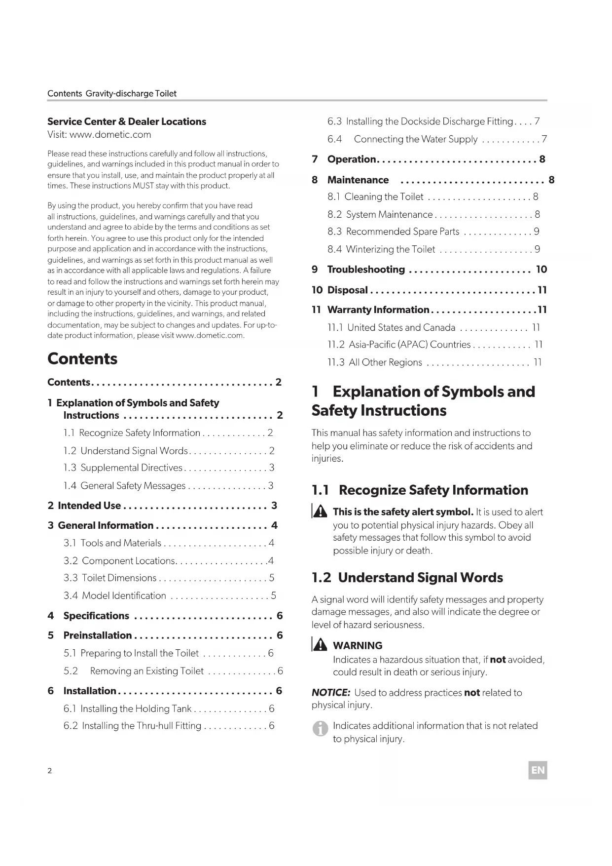 - .3 All Other Regions Service Center & Dealer LocationsVisit: www.dometic.comPlease read these instructions carefully and follow all instructions, guidelines, and warnings included in this product manual in order to ensure that you install, use, and maintain the product properly at all times. These instructions MUST stay with this product.By using the product, you hereby confirm that you have read all instructions, guidelines, and warnings carefully and that you understand and agree to abide by the terms and conditions as set forth herein. You agree to use this product only for the intended purpose and application and in accordance with the instructions, guidelines, and warnings as set forth in this product manual as well as in accordance with all applicable laws and regulations. A failure to read and follow the instructions and warnings set forth herein may result in an injury to yourself and others, damage to your product, or damage to other property in the vicinity. This product manual, including the instructions, guidelines, and warnings, and related documentation, may be subject to changes and updates. For up-to-date product information, please visit www.dometic.com. Contents 1 Explanation of Symbols and Safety Instructions This manual has safety information and instructions to help you eliminate or reduce the risk of accidents and injuries. p. 11