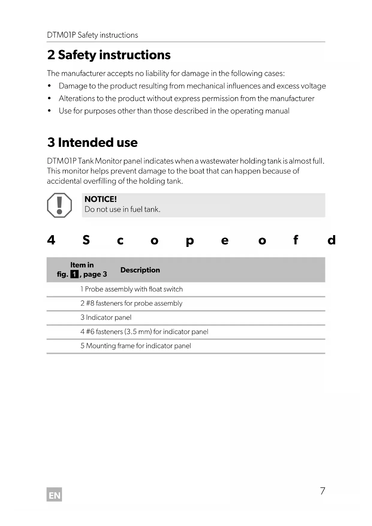 - Use for purposes other than those described in the operating manual 3 Intended use DTM01P Tank Monitor panel indicates when a wastewater holding tank is almost full. This monitor helps prevent damage to the boat that can happen because of accidental overfilling of the holding tank.
