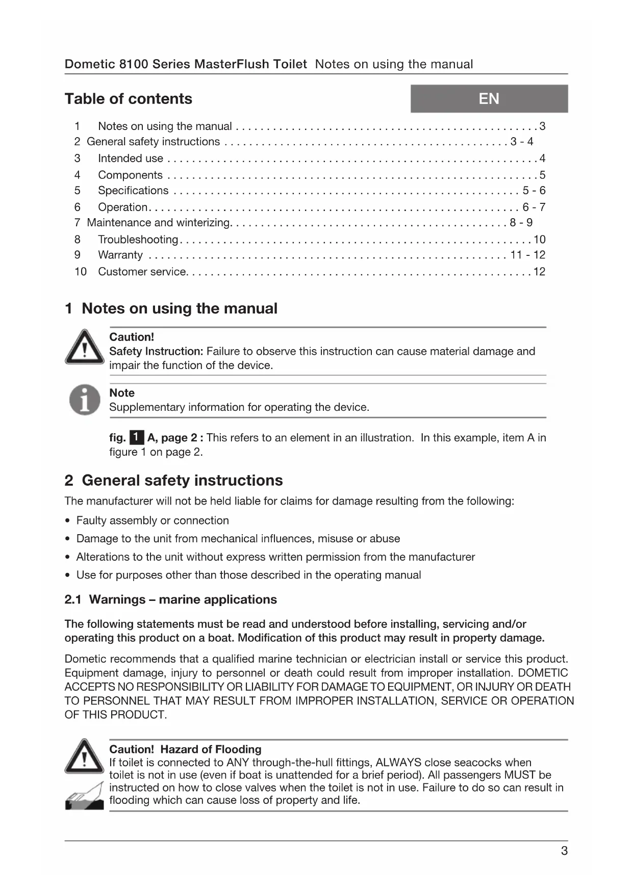 - Use for purposes other than those described in the operating manual Dometic 8100 Series MasterFlush Toilet Notes on using the manual Caution! Hazard of Flooding If toilet is connected to ANY through-the-hull ttings, ALWAYS close seacocks when toilet is not in use (even if boat is unattended for a brief period). All passengers MUST be instructed on how to close valves when the toilet is not in use. Failure to do so can result in ooding which can cause loss of property and life.4 Caution! Hazard of Flooding If the toilet uses fresh water for ushing and is connected directly or indirectly to a shore- side municipal water system at ANY time, shoreside water connections MUST be discon- nected if the boat is unattended (even if boat is unattended for a brief period). Failure to do so can result in ooding which can cause loss of property and life. Caution! Hazard of Flooding Before beginning any work on this product, be sure that all electrical power to the unit has been turned off and that seacocks are in the CLOSED or OFF position. Failure to do so can result in ooding which can cause loss of property and life. Caution! Overlling the holding tank can create serious damage to the sanitation system, such as rupturing the holding tank and releasing tank contents into the bilge. To prevent this pos- sibility, Dometic recommends using the “full” tank shut-down relay in the toilet’s electronic control module. The “full” signal from the holding tank can be generated by an optional Dometic DTM01C tank monitor or DTM04 four-level tank monitor system. 3 Intended use The Dometic 8100 series MasterFlush toilet provides an electric-ush toilet that macerates waste and pumps it to a holding tank or other efuent storage/disposal system. Operated by a wall- mounted ush switch, the toilet allows the user to add water to the bowl (before or after ushing) and to ush the toilet by pushing a button.