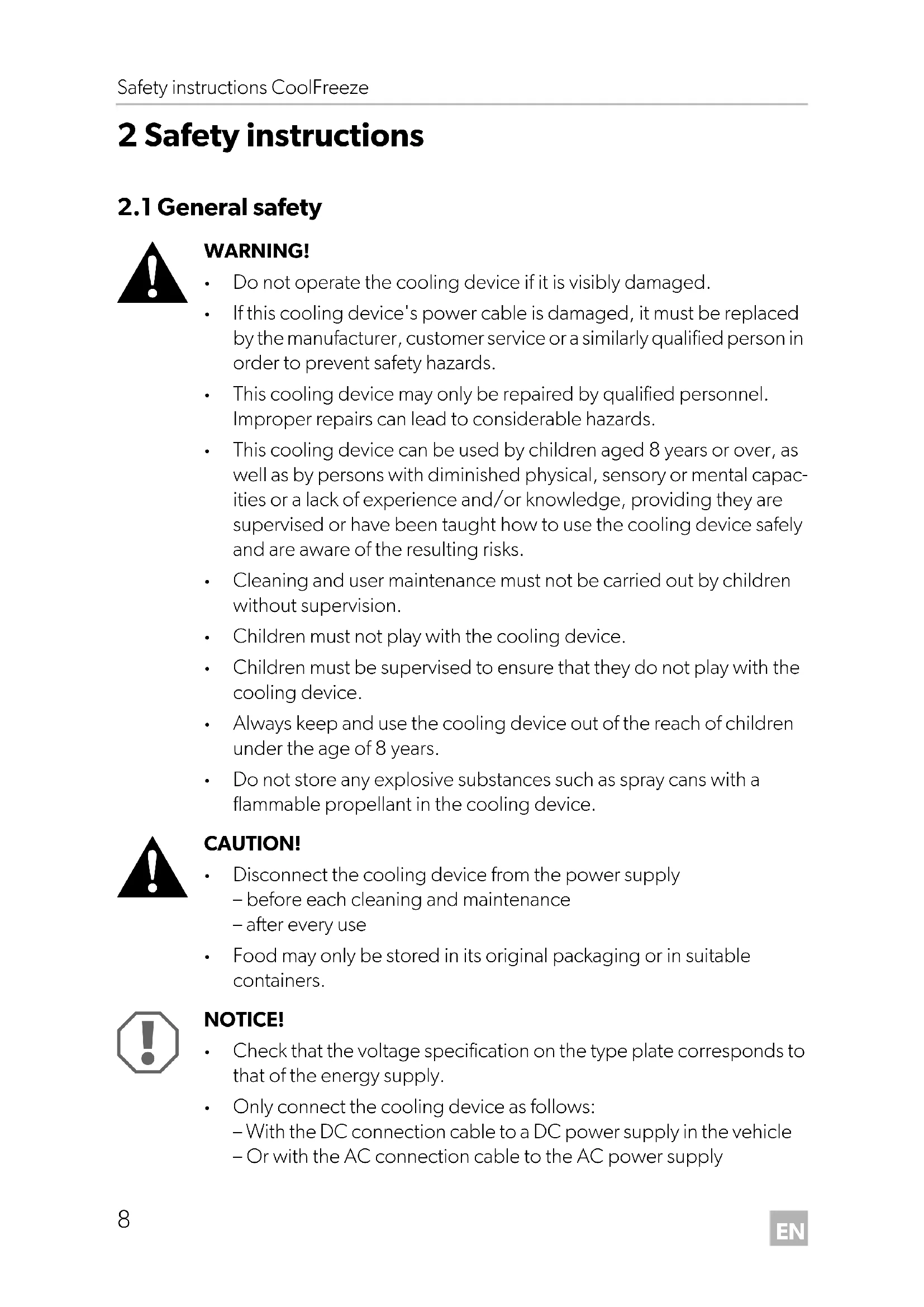 DANGER! Safety instruction: Failure to observe this instruction will cause fatal or serious injury. WARNING! Safety instruction: Failure to observe this instruction can cause fatal or serious injury. CAUTION! Safety instruction: Failure to observe this instruction can lead to injury. NOTICE! Failure to observe this instruction can cause material damage and impair the function of the product. NOTE Supplementary information for operating the product. CF80_CF110-O-US.book Seite 7 Mittwoch, 30. August 2017 2:57 14EN Safety instructions CoolFreeze