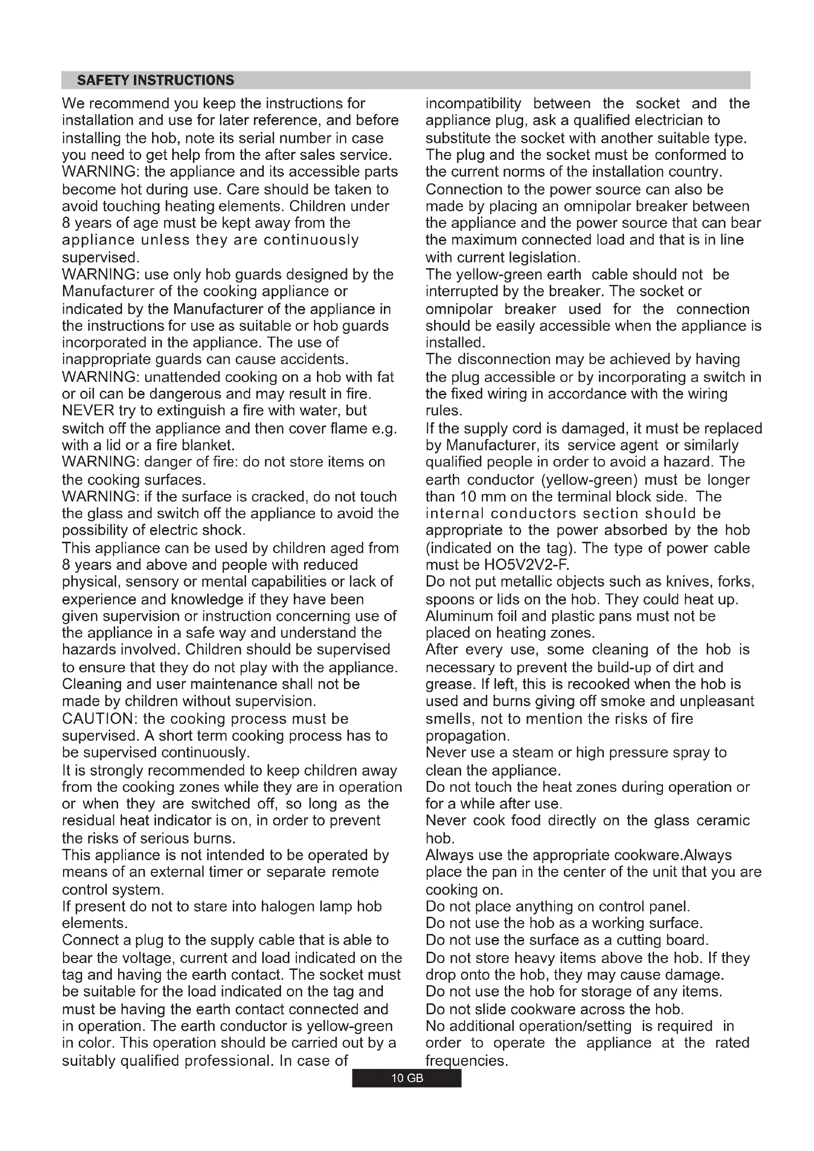 the glass and switch off the appliance to avoid the possibility of electric shock. This appliance can be used by children aged from 8 years and above and people with reduced physical, sensory or mental capabilities or lack of experience and knowledge if they have been given supervision or instruction concerning use of the appliance in a safe way and understand the hazards involved. Children should be supervised to ensure that they do not play with the appliance. Cleaning and user maintenance shall not be made by children without supervision. CAUTION: the cooking process must be supervised. A short term cooking process has to be supervised continuously. It is strongly recommended to keep children away from the cooking zones while they are in operation or when they are switched off, so long as the residual heat indicator is on, in order to prevent the risks of serious burns. This appliance is not intended to be operated by means of an external timer or separate remote control system. If present do not to stare into halogen lamp hob elements. Connect a plug to the supply cable that is able to bear the voltage, current and load indicated on the tag and having the earth contact. The socket must be suitable for the load indicated on the tag and must be having the earth contact connected and in operation. The earth conductor is yellow-green in color. This operation should be carried out by a suitably qualified professional. In case of SAFETY INSTRUCTIONS incompatibility between the socket and the appliance plug, ask a qualified electrician to substitute the socket with another suitable type. The plug and the socket must be conformed to the current norms of the installation country. Connection to the power source can also be made by placing an omnipolar breaker between the appliance and the power source that can bear the maximum connected load and that is in line with current legislation. The yellow-green earth cable should not be interrupted by the breaker. The socket or omnipolar breaker used for the connection should be easily accessible when the appliance is installed. The disconnection may be achieved by having the plug accessible or by incorporating a switch in the fixed wiring in accordance with the wiring rules. If the supply cord is damaged, it must be replaced by Manufacturer, its service agent or similarly qualified people in order to avoid a hazard. The earth conductor (yellow-green) must be longer than 10 mm on the terminal block side. The internal conductors section should be appropriate to the power absorbed by the hob (indicated on the tag). The type of power cable must be HO5V2V2-F. Do not put metallic objects such as knives, forks, spoons or lids on the hob. They could heat up. Aluminum foil and plastic pans must not be placed on heating zones. After every use, some cleaning of the hob is necessary to prevent the build-up of dirt and grease. If left, this is recooked when the hob is used and burns giving off smoke and unpleasant smells, not to mention the risks of fire propagation. Never use a steam or high pressure spray to clean the appliance. Do not touch the heat zones during operation or for a while after use. Never cook food directly on the glass ceramic hob. Always use the appropriate cookware.Always place the pan in the center of the unit that you are cooking on. Do not place anything on control panel. Do not use the hob as a working surface. Do not use the surface as a cutting board. Do not store heavy items above the hob. If they drop onto the hob, they may cause damage. Do not use the hob for storage of any items. Do not slide cookware across the hob. No additional operation/setting is required in order to operate the appliance at the rated frequencies. 10 GBLeave a distance of at least 55 mm between the hob and the back wall and of at least 150 mm between the hob and the vertical furniture or walls in the lateral side. If a furniture is installed above the hob, the minimum distance required is 700 mm. When installing a hood above the hob, please consult the installation requirements specified for the hood but, in any case, the distance between the hob and the hood must not be lower than 700 mm.