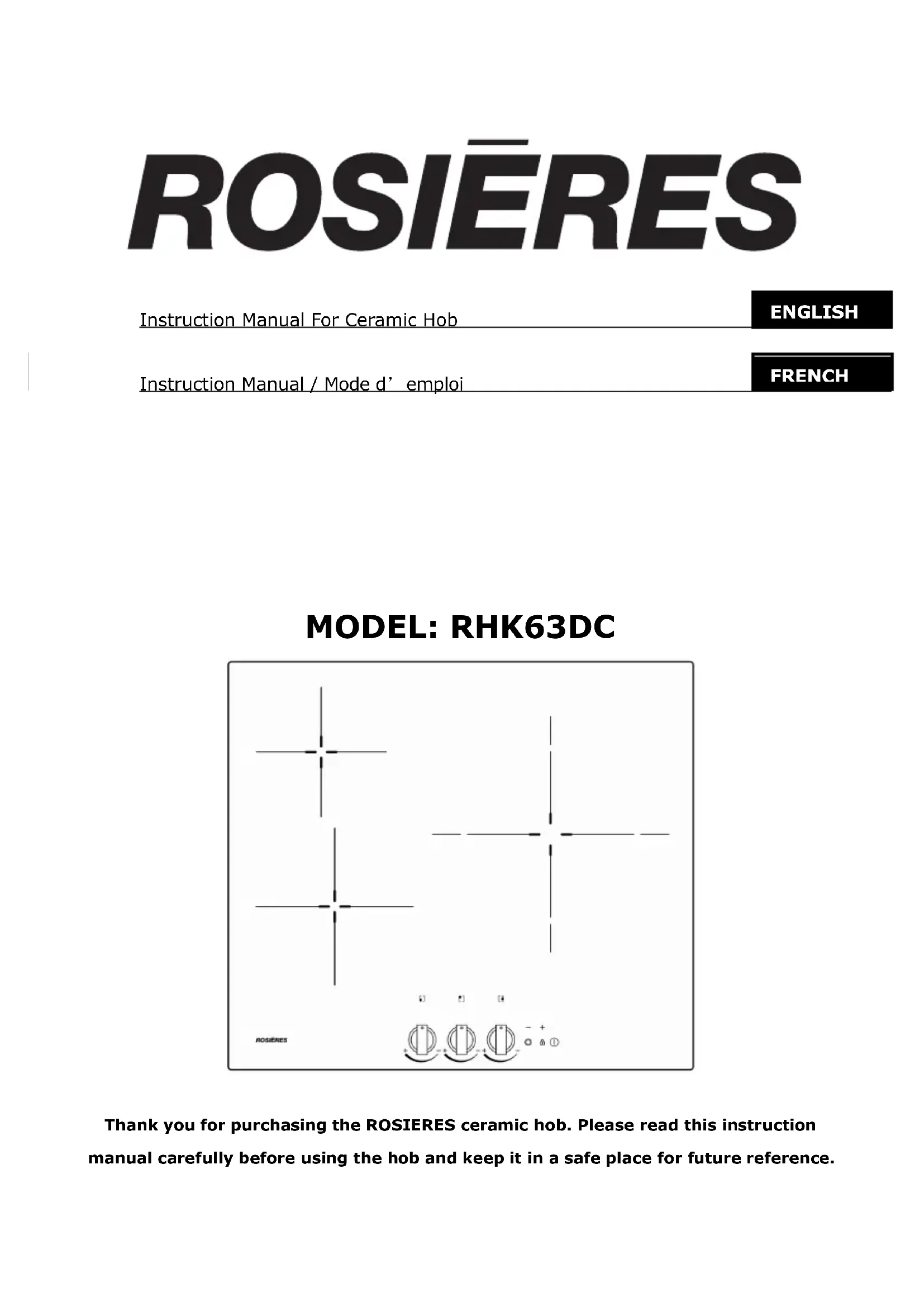 Thank you for purchasing the ROSIERES ceramic hob. Please read this instruction manual carefully before using the hob and keep it in a safe place for future reference. ENGLISH FRENCHEN-1 By placing the mark on this product, we are confirming compliance to all relevant European safety, health and environmental requirements which are applicable in legislation for this product. Safety Warnings Your safety is important to us. Please read this information before using your cooktop. Installation Electrical Shock Hazard