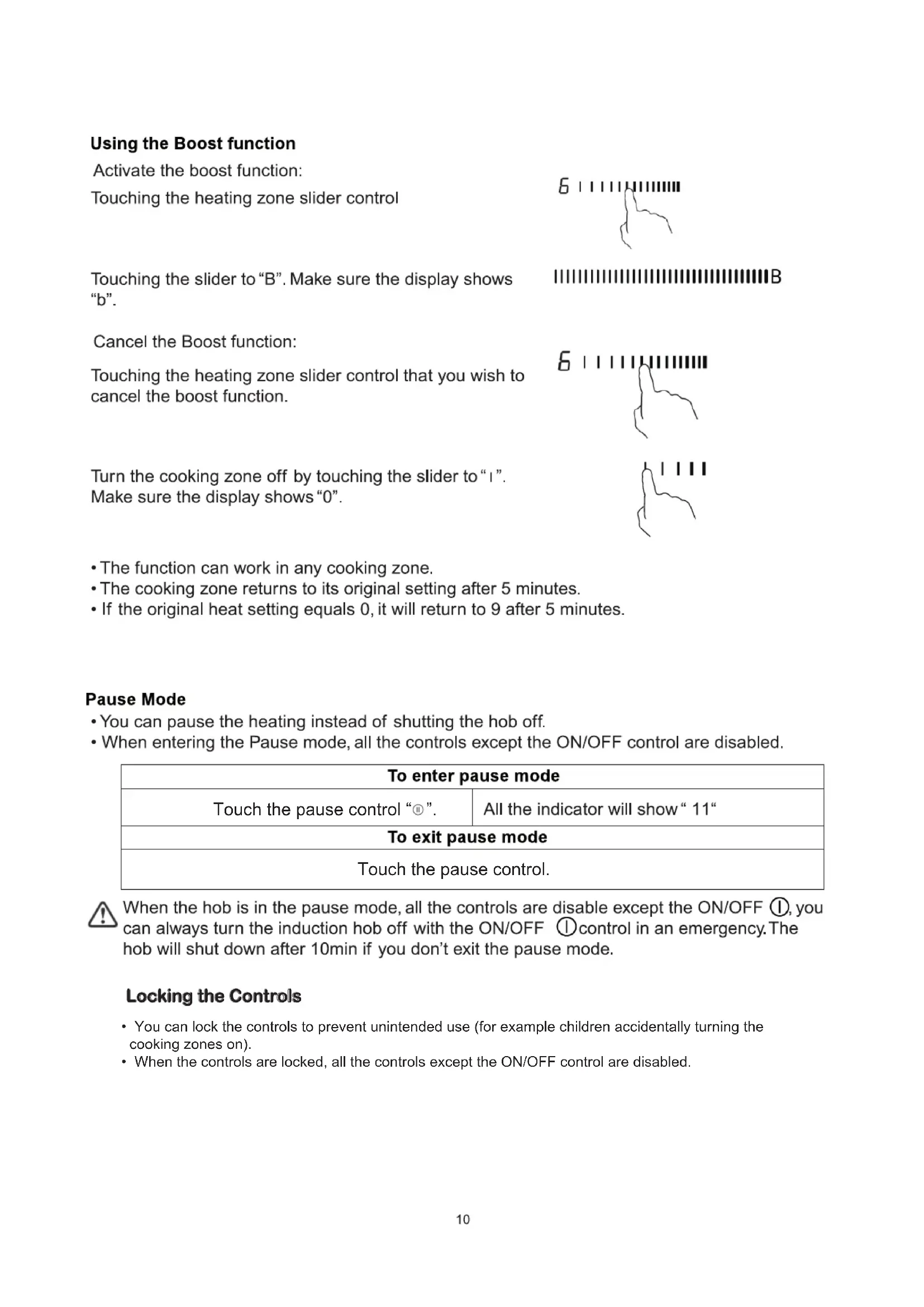 Then the hob will be turned off.13 Set one zone Touching the heating zone slider control Set the time by touching the or control of the timer Hint: Touch the “-“ or “+” control of the timer once will decrease or increase by 1 minute. Touch and hold the ”-“ or “+”control of the timer will decrease or increase by 10 minutes. Touching the “-” and “+” together, the timer is cancelled, and the “00” will show in the minute display.