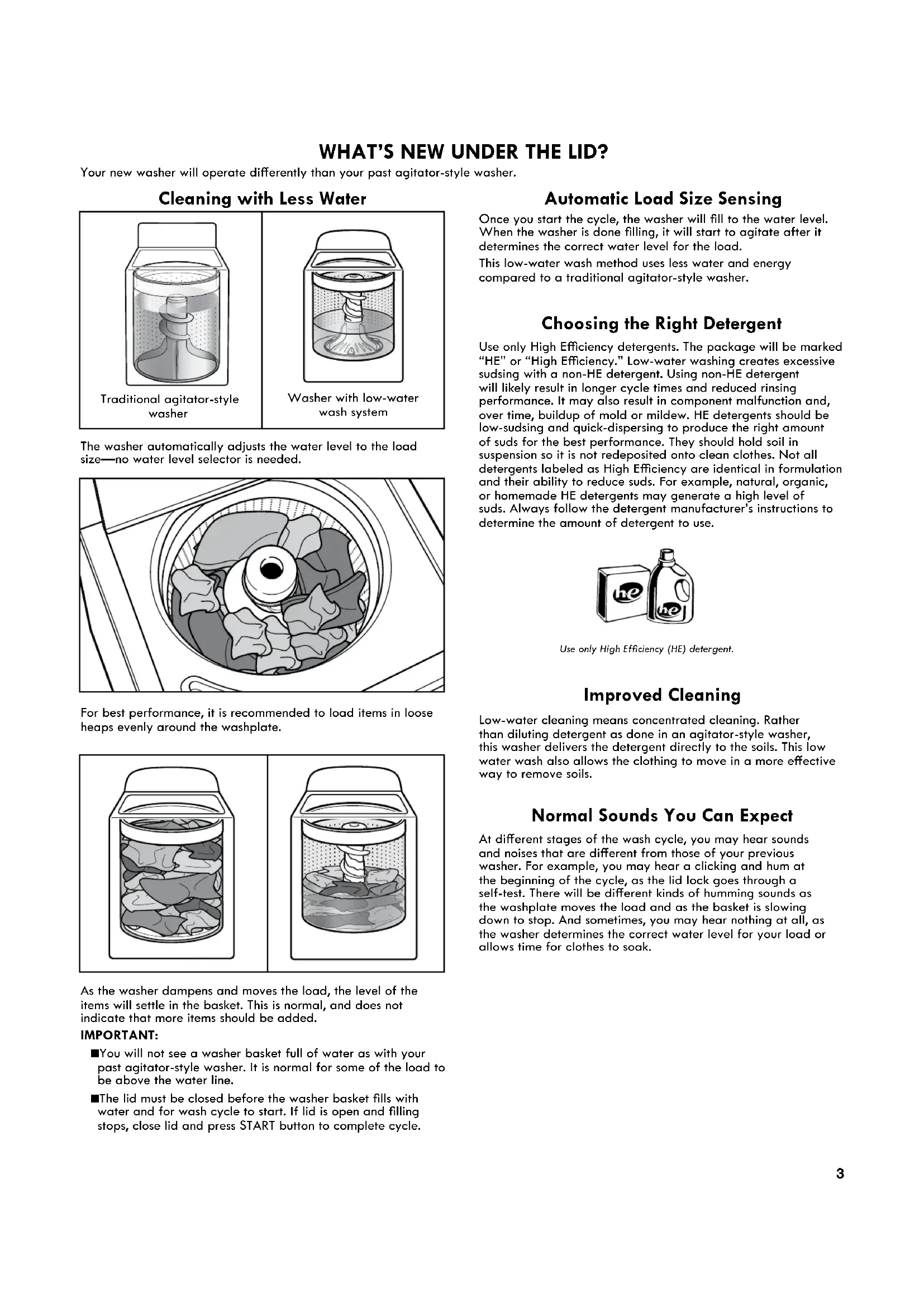 WASHER MAINTENANCE ...............................................10 TROUBLESHOOTING ....................................................... 12 PROTECTION AGREEMENTS ..........................................17 WARRANTY ........................................................................ 17 ASSISTANCE OR SERVICE ...............................Back Cover WASHER SAFETY3 WHAT’S NEW UNDER THE LID? Your new washer will operate dierently than your past agitator-style washer. For best performance, it is recommended to load items in loose heaps evenly around the washplate. As the washer dampens and moves the load, the level of the items will settle in the basket. This is normal, and does not indicate that more items should be added. IMPORTANT: ■ You will not see a washer basket full of water as with your past agitator-style washer. It is normal for some of the load to be above the water line. ■ The lid must be closed before the washer basket lls with water and for wash cycle to start. If lid is open and lling stops, close lid and press START button to complete cycle. Choosing the Right Detergent Use only High Eciency detergents. The package will be marked “HE” or “High Eciency.” Low-water washing creates excessive sudsing with a non-HE detergent. Using non-HE detergent will likely result in longer cycle times and reduced rinsing performance. It may also result in component malfunction and, over time, buildup of mold or mildew. HE detergents should be low-sudsing and quick-dispersing to produce the right amount of suds for the best performance. They should hold soil in suspension so it is not redeposited onto clean clothes. Not all detergents labeled as High Eciency are identical in formulation and their ability to reduce suds. For example, natural, organic, or homemade HE detergents may generate a high level of suds. Always follow the detergent manufacturer’s instructions to determine the amount of detergent to use. Normal Sounds You Can Expect At dierent stages of the wash cycle, you may hear sounds and noises that are dierent from those of your previous washer. For example, you may hear a clicking and hum at the beginning of the cycle, as the lid lock goes through a self-test. There will be dierent kinds of humming sounds as the washplate moves the load and as the basket is slowing down to stop. And sometimes, you may hear nothing at all, as the washer determines the correct water level for your load or allows time for clothes to soak. Use only High Efciency (HE) detergent. Improved Cleaning Low-water cleaning means concentrated cleaning. Rather than diluting detergent as done in an agitator-style washer, this washer delivers the detergent directly to the soils. This low water wash also allows the clothing to move in a more eective way to remove soils. Cleaning with Less Water The washer automatically adjusts the water level to the load size—no water level selector is needed. Traditional agitator-style washer Washer with low-water wash system Washplate Automatic Load Size Sensing Once you start the cycle, the washer will ll to the water level. When the washer is done lling, it will start to agitate after it determines the correct water level for the load. This low-water wash method uses less water and energy compared to a traditional agitator-style washer.4