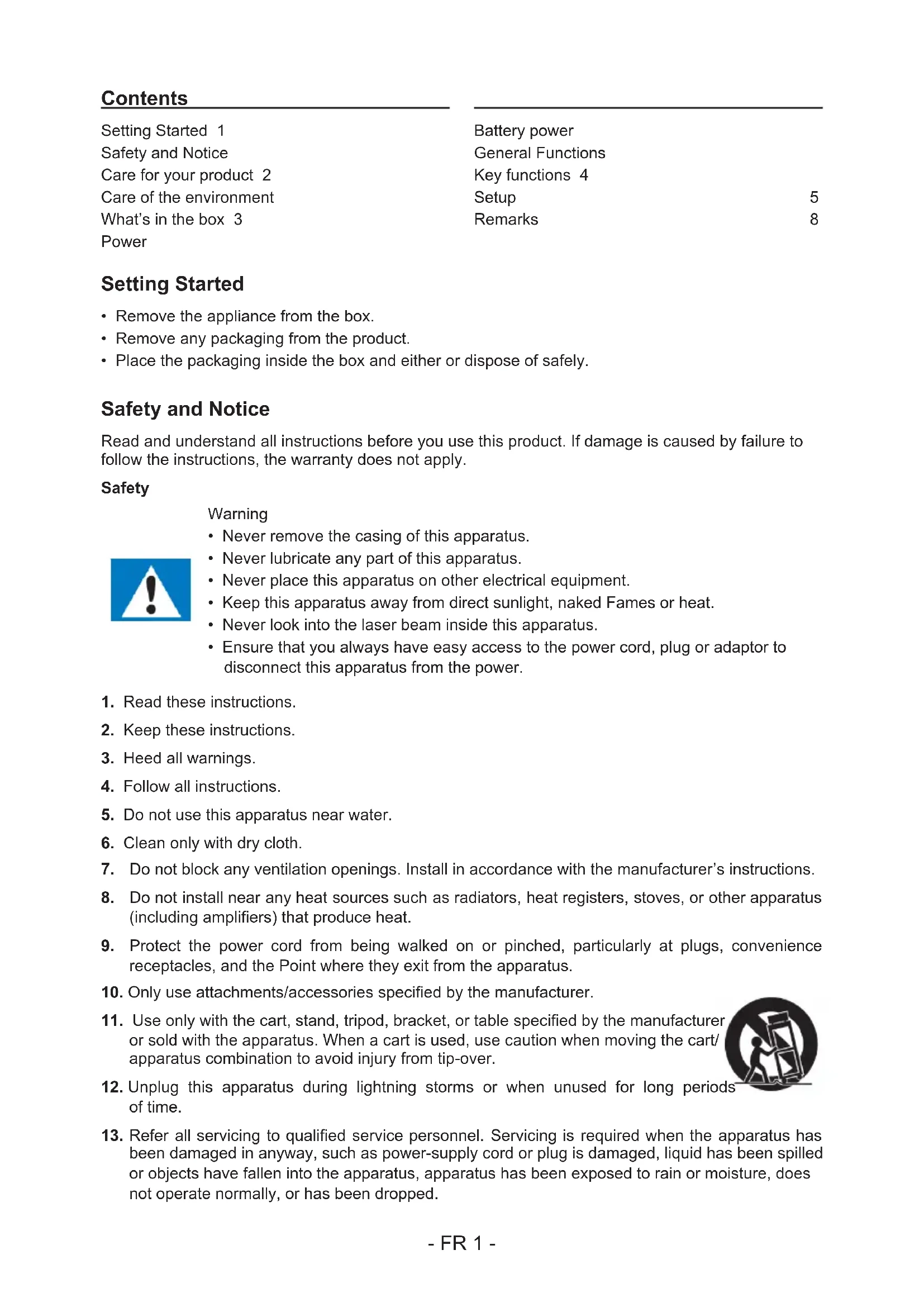FUTURE REFERENCE EN- FR 1 - Contents Setting Started 1 Safety and Notice Care for your product 2 Care of the environment What’s in the box 3 Power Battery power General Functions Key functions 4 Setup 5 Remarks 8 Setting Started
