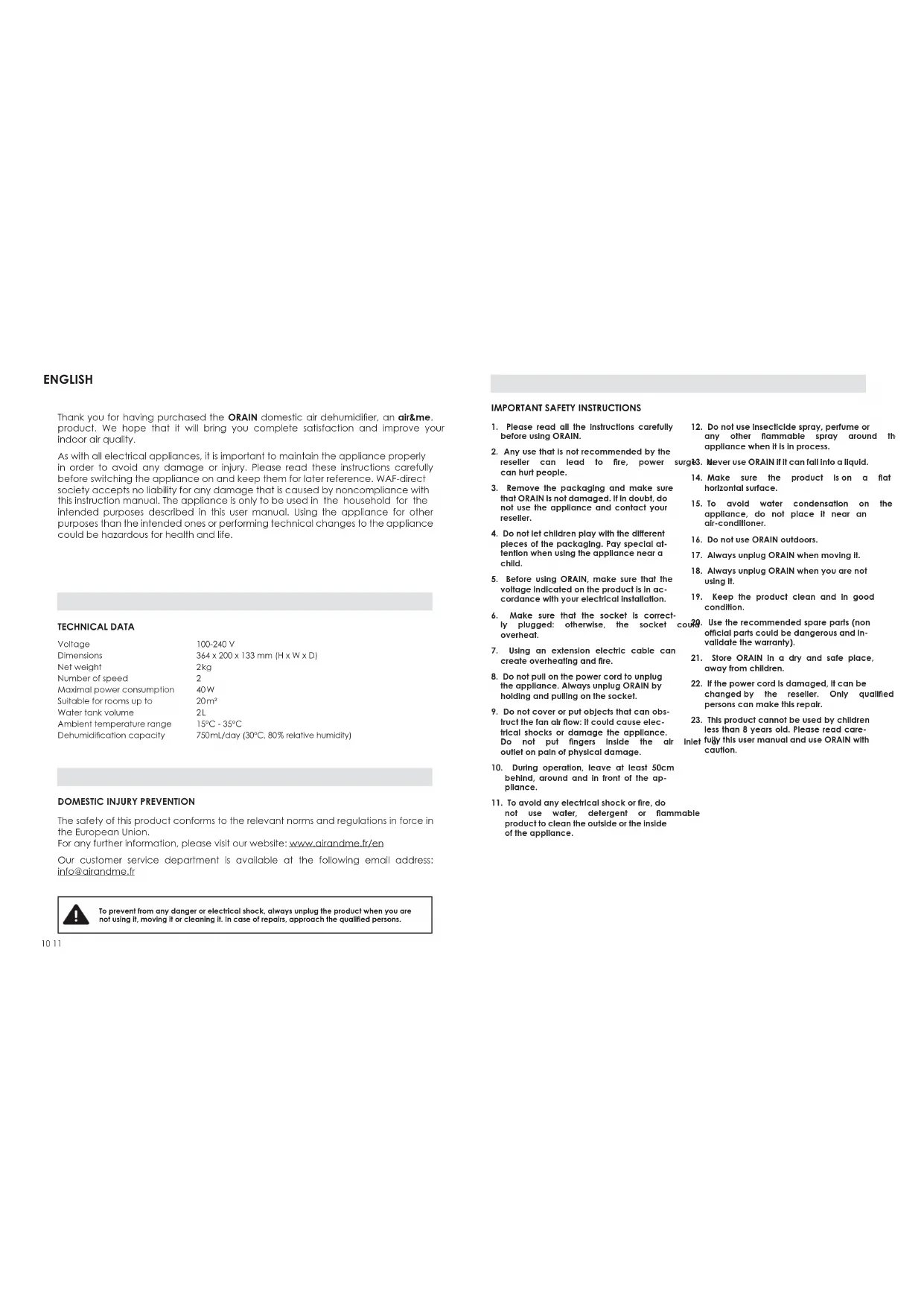 less than 8 years old. Please read care- fully this user manual and use ORAIN with caution. Thank you for having purchased the ORAIN domestic air dehumidier, an air&me. product. We hope that it will bring you complete satisfaction and improve your indoor air quality. As with all electrical appliances, it is important to maintain the appliance properly in order to avoid any damage or injury. Please read these instructions carefully before switching the appliance on and keep them for later reference. WAF-direct society accepts no liability for any damage that is caused by noncompliance with this instruction manual. The appliance is only to be used in the household for the intended purposes described in this user manual. Using the appliance for other purposes than the intended ones or performing technical changes to the appliance could be hazardous for health and life. ENGLISH