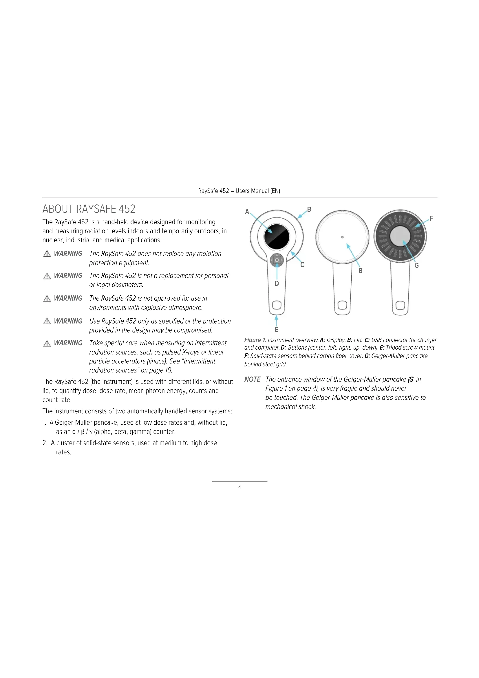 Typical energy response ................................................................ SOFTWARE LICENSES ................................................................ WARRANTY ................................................................................. SERVICE AND SUPPORT CONTACTS ......................................... Users Manual (EN)4 RaySafe 452 – Users Manual (EN) ABOUT RAYSAFE 452 The RaySafe 452 is a hand-held device designed for monitoring and measuring radiation levels indoors and temporarily outdoors, in nuclear, industrial and medical applications. Manufacturer Date of manufacture Catalogue number Serial number Consult the instructions for Caution CCC Mark LOT Mark / Batch WARNING The RaySafe 452 does not replace any radiation protection equipment. Manufacturer Date of manufacture Catalogue number Serial number Consult the instructions for Caution CCC Mark LOT Mark / Batch WARNING The RaySafe 452 is not a replacement for personal or legal dosimeters. Manufacturer Date of manufacture Catalogue number Serial number Consult the instructions for Caution CCC Mark LOT Mark / Batch WARNING The RaySafe 452 is not approved for use in environments with explosive atmosphere. Manufacturer Date of manufacture Catalogue number Serial number Consult the instructions for Caution CCC Mark LOT Mark / Batch WARNING Use RaySafe 452 only as specified or the protection provided in the design may be compromised. Manufacturer Date of manufacture Catalogue number Serial number Consult the instructions for Caution CCC Mark LOT Mark / Batch WARNING Take special care when measuring on intermittent radiation sources, such as pulsed X-rays or linear particle accelerators (linacs). See "Intermittent radiation sources" on page 10. The RaySafe 452 (the instrument) is used with dierent lids, or without lid, to quantify dose, dose rate, mean photon energy, counts and count rate. The instrument consists of two automatically handled sensor systems: