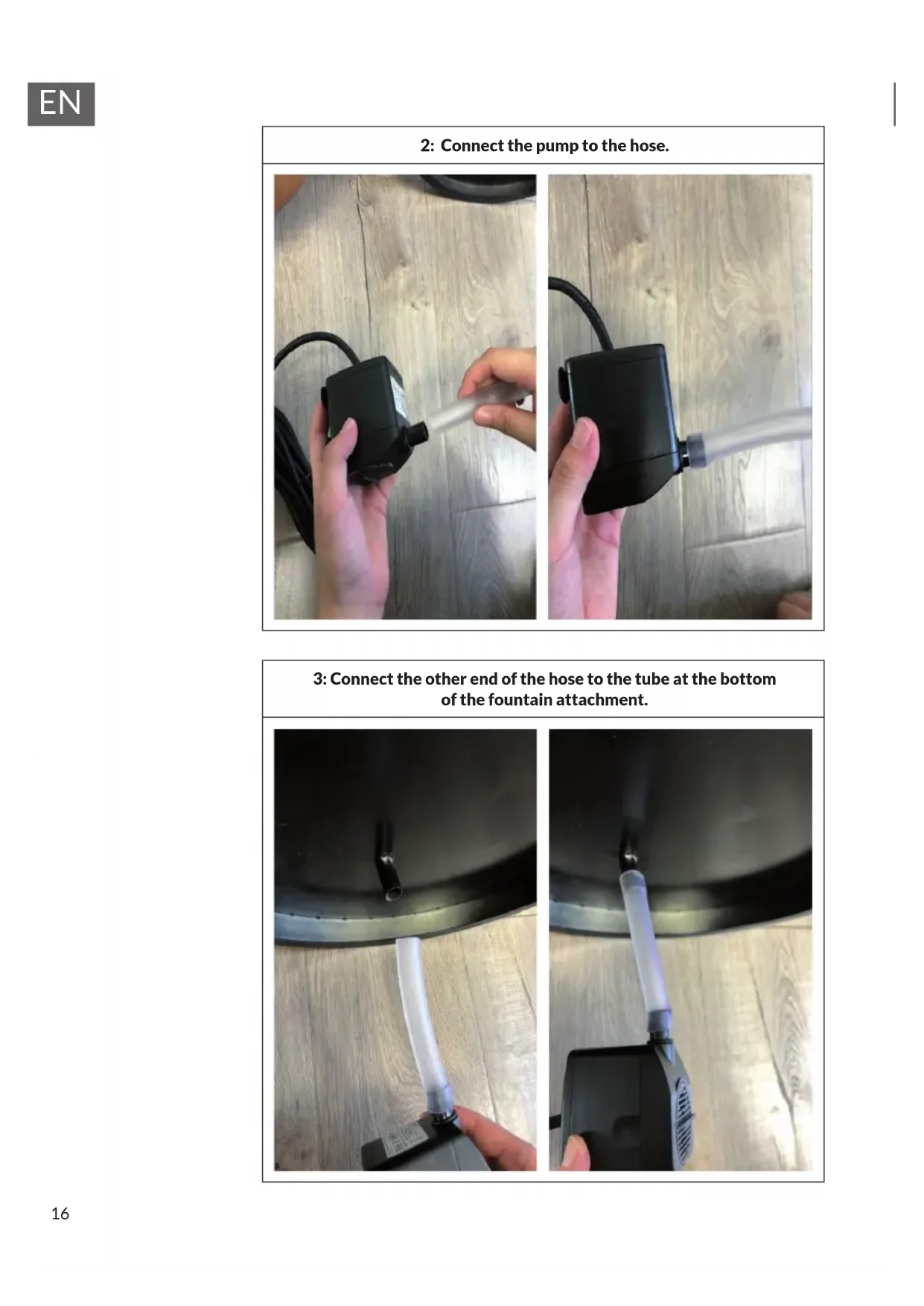 2: Connect the pump to the hose. 3: Connect the other end of the hose to the tube at the bottom of the fountain attachment.17