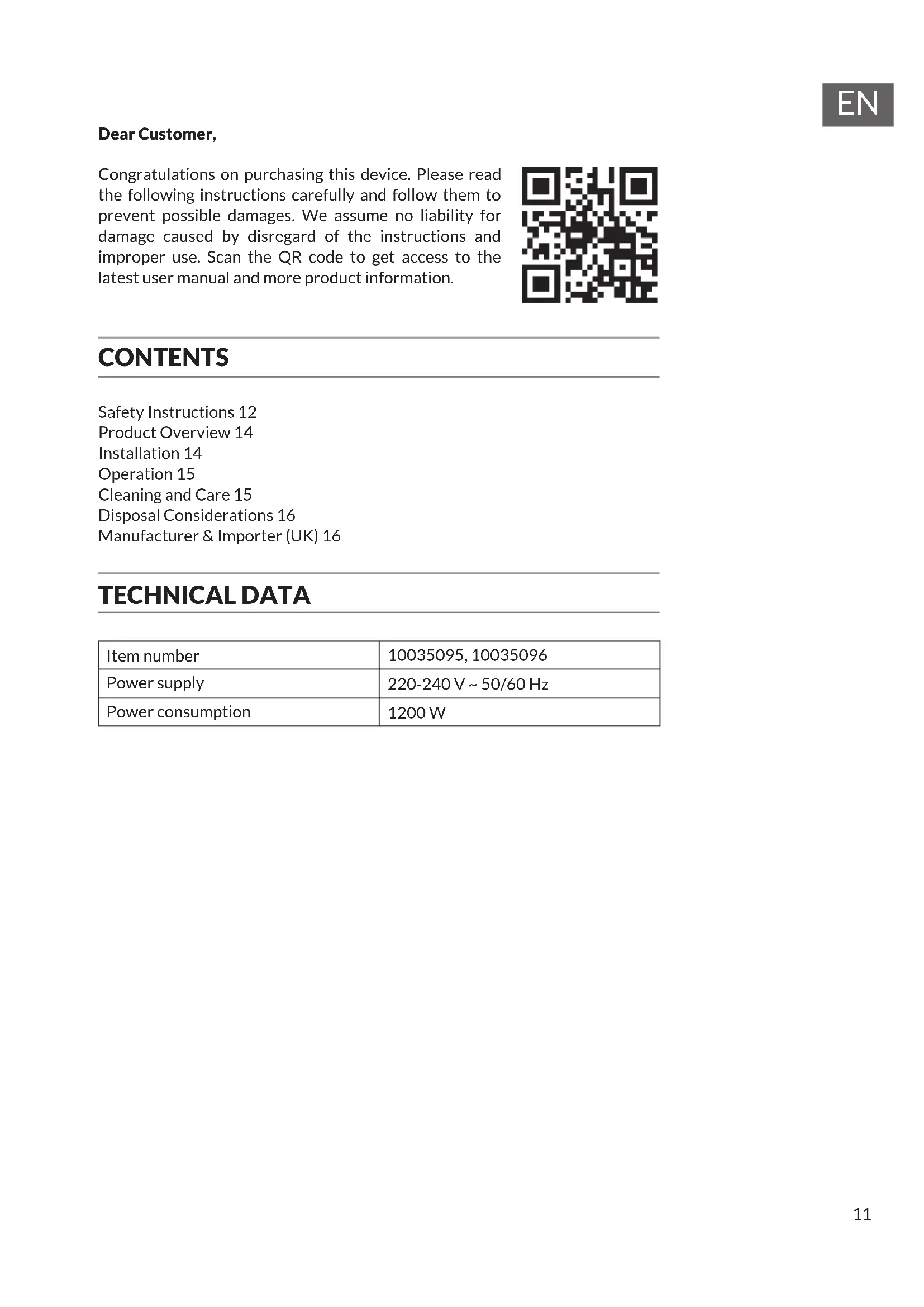 Dear Customer, Congratulations on purchasing this device. Please read the following instructions carefully and follow them to prevent possible damages. We assume no liability for damage caused by disregard of the instructions and improper use. Scan the QR code to get access to the latest user manual and more product information. CONTENTS Safety Instructions 12 Product Overview 14 Installation 14 Operation 15 Cleaning and Care 15 Disposal Considerations 16 Manufacturer & Importer (UK) 16 TECHNICAL DATA Item number 10035095, 10035096 Power supply 220-240 V ~ 50/60 Hz Power consumption 1200 W12