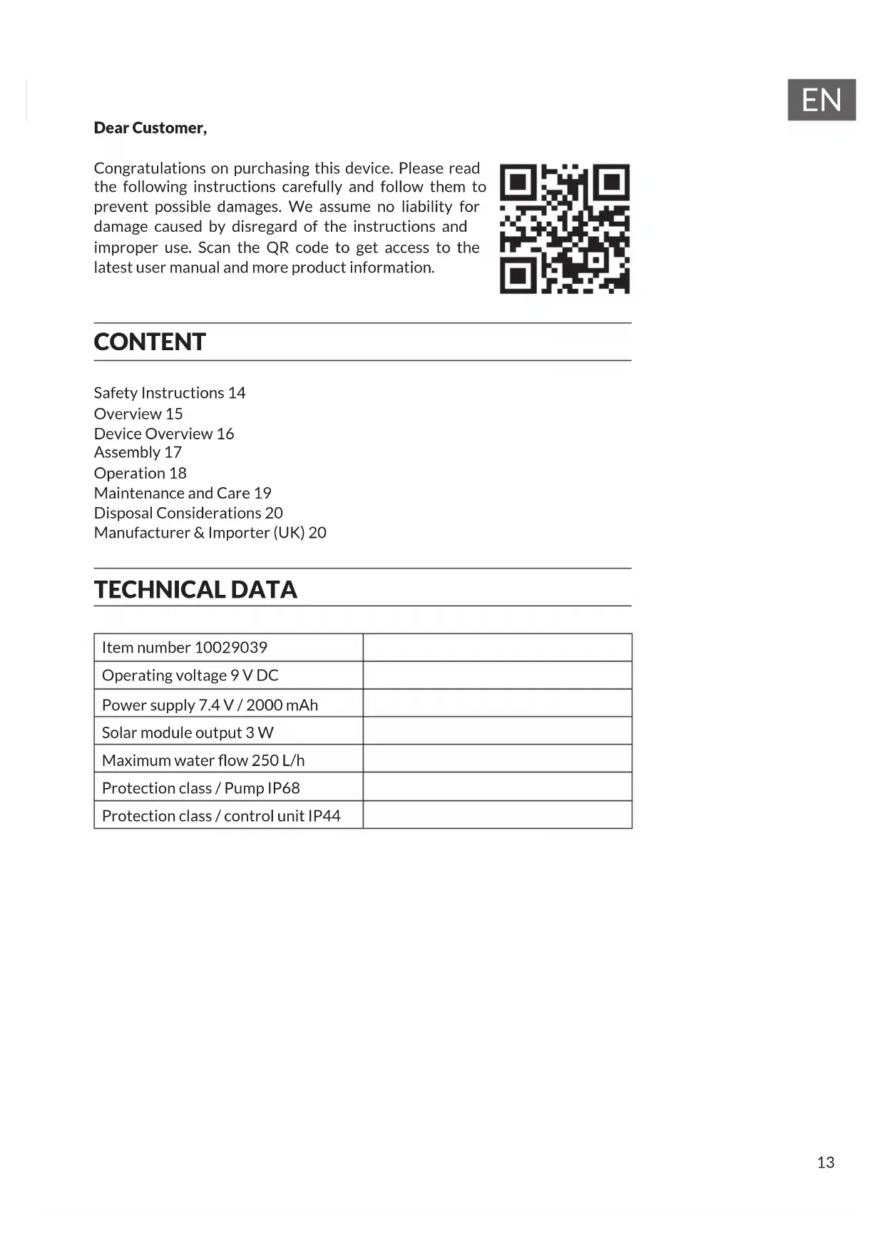 Dear Customer, Congratulations on purchasing this device. Please read the following instructions carefully and follow them to prevent possible damages. We assume no liability for damage caused by disregard of the instructions and improper use. Scan the QR code to get access to the latest user manual and more product information. CONTENT Safety Instructions 14 Overview 15 Device Overview 16 Assembly 17 Operation 18 Maintenance and Care 19 Disposal Considerations 20 Manufacturer & Importer (UK) 20 TECHNICAL DATA Item number 10029039 Operating voltage 9 V DC Power supply 7.4 V / 2000 mAh Solar module output 3 W Maximum water ow 250 L/h Protection class / Pump IP68 Protection class / control unit IP4414