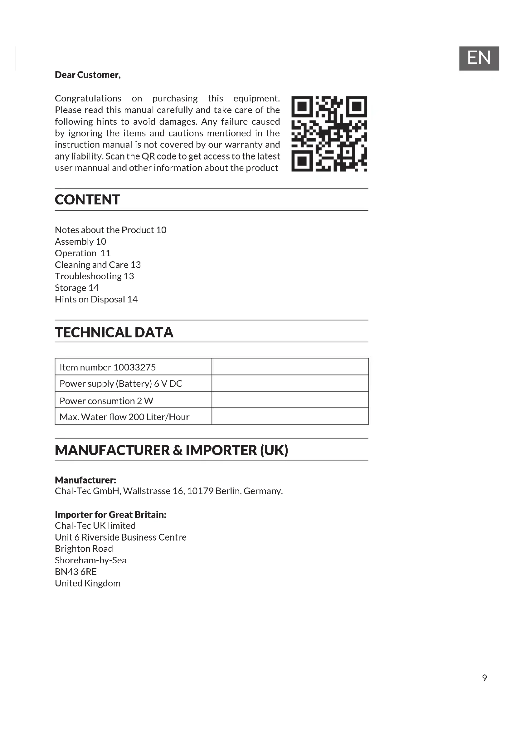 Dear Customer, Congratulations on purchasing this equipment. Please read this manual carefully and take care of the following hints to avoid damages. Any failure caused by ignoring the items and cautions mentioned in the instruction manual is not covered by our warranty and any liability. Scan the QR code to get access to the latest user mannual and other information about the product CONTENT Notes about the Product 10 Assembly 10 Operation 11 Cleaning and Care 13 Troubleshooting 13 Storage 14 Hints on Disposal 14 TECHNICAL DATA Item number 10033275 Power supply (Battery) 6 V DC Power consumtion 2 W Max. Water ow 200 Liter/Hour MANUFACTURER & IMPORTER (UK) Manufacturer: Chal-Tec GmbH, Wallstrasse 16, 10179 Berlin, Germany. Importer for Great Britain: Chal-Tec UK limited Unit 6 Riverside Business Centre Brighton Road Shoreham-by-Sea BN43 6RE United Kingdom10