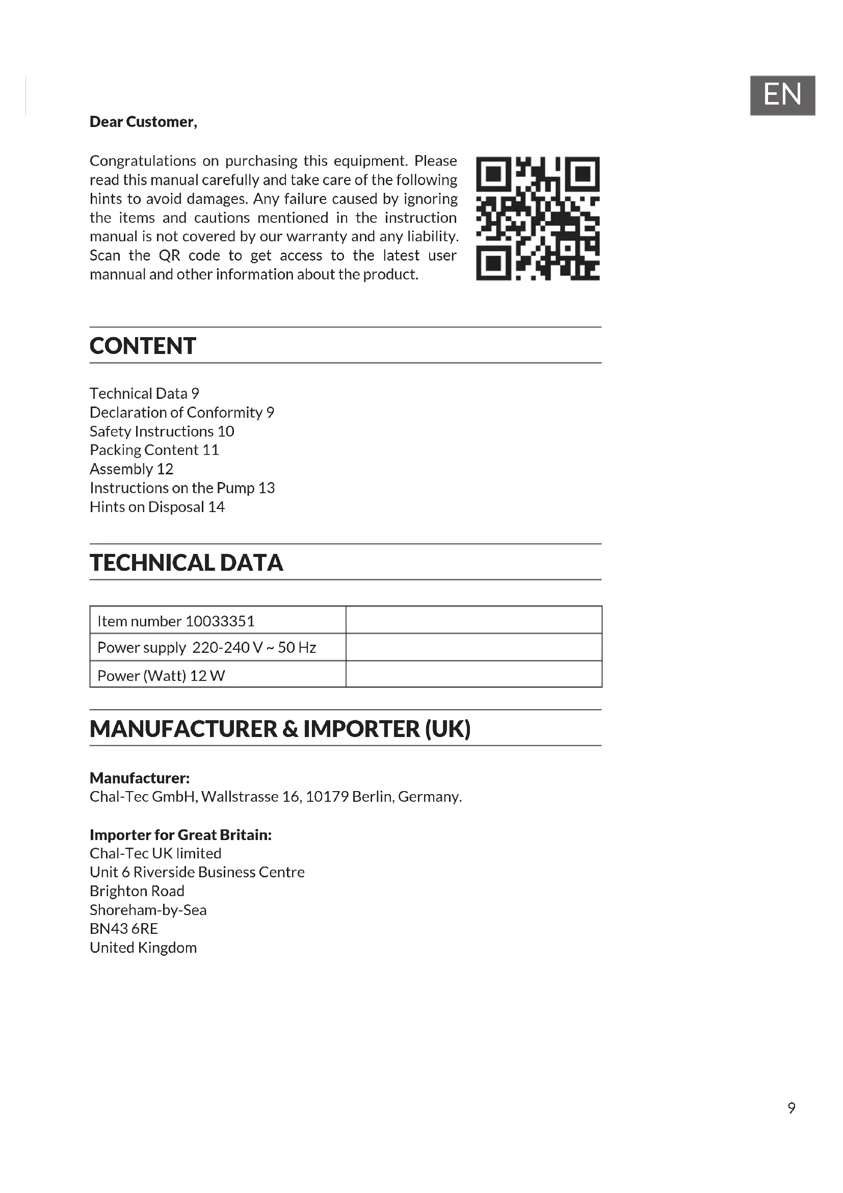Dear Customer, Congratulations on purchasing this equipment. Please read this manual carefully and take care of the following hints to avoid damages. Any failure caused by ignoring the items and cautions mentioned in the instruction manual is not covered by our warranty and any liability. Scan the QR code to get access to the latest user mannual and other information about the product. CONTENT TECHNICAL DATA Item number 10033351 Power supply 220-240 V ~ 50 Hz Power (Watt) 12 W MANUFACTURER & IMPORTER (UK) Manufacturer: Chal-Tec GmbH, Wallstrasse 16, 10179 Berlin, Germany. Importer for Great Britain: Chal-Tec UK limited Unit 6 Riverside Business Centre Brighton Road Shoreham-by-Sea BN43 6RE United Kingdom Technical Data9 Declaration of Conformity9 Safety Instructions10 Packing Content11 Assembly12 Instructions on the Pump13 Hints on Disposal1410