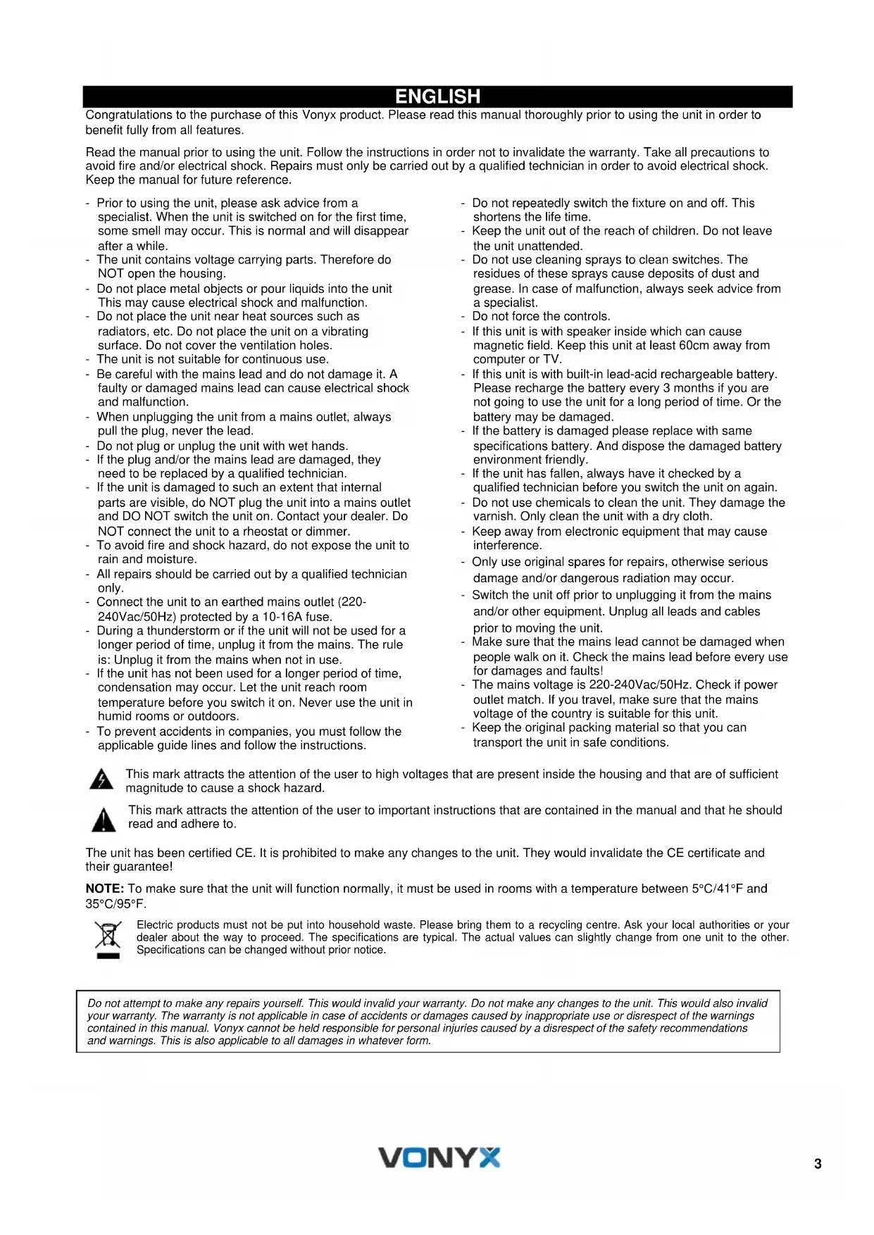 MANUEL D'INSTRUCTIONS V1.123 ENGLISH Congratulations to the purchase of this Vonyx product. Please read this manual thoroughly prior to using the unit in order to benefit fully from all features. Read the manual prior to using the unit. Follow the instructions in order not to invalidate the warranty. Take all precautions to avoid fire and/or electrical shock. Repairs must only be carried out by a qualified technician in order to avoid electrical shock. Keep the manual for future reference. - Prior to using the unit, please ask advice from a specialist. When the unit is switched on for the first time, some smell may occur. This is normal and will disappear after a while. - The unit contains voltage carrying parts. Therefore do NOT open the housing. - Do not place metal objects or pour liquids into the unit This may cause electrical shock and malfunction. - Do not place the unit near heat sources such as radiators, etc. Do not place the unit on a vibrating surface. Do not cover the ventilation holes. - The unit is not suitable for continuous use. - Be careful with the mains lead and do not damage it. A faulty or damaged mains lead can cause electrical shock and malfunction. - When unplugging the unit from a mains outlet, always pull the plug, never the lead. - Do not plug or unplug the unit with wet hands. - If the plug and/or the mains lead are damaged, they need to be replaced by a qualified technician. - If the unit is damaged to such an extent that internal parts are visible, do NOT plug the unit into a mains outlet and DO NOT switch the unit on. Contact your dealer. Do NOT connect the unit to a rheostat or dimmer. - To avoid fire and shock hazard, do not expose the unit to rain and moisture. - All repairs should be carried out by a qualified technician only. - Connect the unit to an earthed mains outlet (220- 240Vac/50Hz) protected by a 10-16A fuse. - During a thunderstorm or if the unit will not be used for a longer period of time, unplug it from the mains. The rule is: Unplug it from the mains when not in use. - If the unit has not been used for a longer period of time, condensation may occur. Let the unit reach room temperature before you switch it on. Never use the unit in humid rooms or outdoors. - To prevent accidents in companies, you must follow the applicable guide lines and follow the instructions. - Do not repeatedly switch the fixture on and off. This shortens the life time. - Keep the unit out of the reach of children. Do not leave the unit unattended. - Do not use cleaning sprays to clean switches. The residues of these sprays cause deposits of dust and grease. In case of malfunction, always seek advice from a specialist. - Do not force the controls. - If this unit is with speaker inside which can cause magnetic field. Keep this unit at least 60cm away from computer or TV. - If this unit is with built-in lead-acid rechargeable battery. Please recharge the battery every 3 months if you are not going to use the unit for a long period of time. Or the battery may be damaged. - If the battery is damaged please replace with same specifications battery. And dispose the damaged battery environment friendly. - If the unit has fallen, always have it checked by a qualified technician before you switch the unit on again. - Do not use chemicals to clean the unit. They damage the varnish. Only clean the unit with a dry cloth. - Keep away from electronic equipment that may cause interference. - Only use original spares for repairs, otherwise serious damage and/or dangerous radiation may occur. - Switch the unit off prior to unplugging it from the mains and/or other equipment. Unplug all leads and cables prior to moving the unit. - Make sure that the mains lead cannot be damaged when people walk on it. Check the mains lead before every use for damages and faults! - The mains voltage is 220-240Vac/50Hz. Check if power outlet match. If you travel, make sure that the mains voltage of the country is suitable for this unit. - Keep the original packing material so that you can transport the unit in safe conditions. This mark attracts the attention of the user to high voltages that are present inside the housing and that are of sufficient magnitude to cause a shock hazard. This mark attracts the attention of the user to important instructions that are contained in the manual and that he should read and adhere to. The unit has been certified CE. It is prohibited to make any changes to the unit. They would invalidate the CE certificate and their guarantee! NOTE: To make sure that the unit will function normally, it must be used in rooms with a temperature between 5°C/41°F and 35°C/95°F. Electric products must not be put into household waste. Please bring them to a recycling centre. Ask your local authorities or your dealer about the way to proceed. The specifications are typical. The actual values can slightly change from one unit to the other. Specifications can be changed without prior notice.