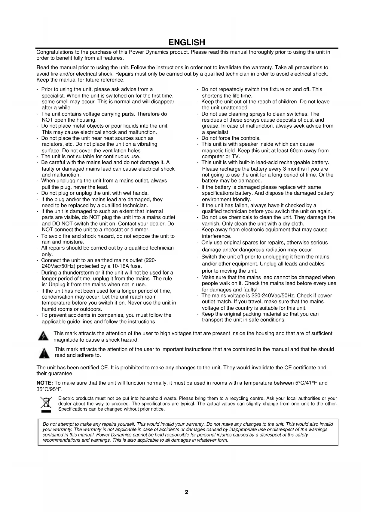 V1.12 ENGLISH Congratulations to the purchase of this Power Dynamics product. Please read this manual thoroughly prior to using the unit in order to benefit fully from all features. Read the manual prior to using the unit. Follow the instructions in order not to invalidate the warranty. Take all precautions to avoid fire and/or electrical shock. Repairs must only be carried out by a qualified technician in order to avoid electrical shock. Keep the manual for future reference. - Prior to using the unit, please ask advice from a specialist. When the unit is switched on for the first time, some smell may occur. This is normal and will disappear after a while. - The unit contains voltage carrying parts. Therefore do NOT open the housing. - Do not place metal objects or pour liquids into the unit This may cause electrical shock and malfunction. - Do not place the unit near heat sources such as radiators, etc. Do not place the unit on a vibrating surface. Do not cover the ventilation holes. - The unit is not suitable for continuous use. - Be careful with the mains lead and do not damage it. A faulty or damaged mains lead can cause electrical shock and malfunction. - When unplugging the unit from a mains outlet, always pull the plug, never the lead. - Do not plug or unplug the unit with wet hands. - If the plug and/or the mains lead are damaged, they need to be replaced by a qualified technician. - If the unit is damaged to such an extent that internal parts are visible, do NOT plug the unit into a mains outlet and DO NOT switch the unit on. Contact your dealer. Do NOT connect the unit to a rheostat or dimmer. - To avoid fire and shock hazard, do not expose the unit to rain and moisture. - All repairs should be carried out by a qualified technician only. - Connect the unit to an earthed mains outlet (220- 240Vac/50Hz) protected by a 10-16A fuse. - During a thunderstorm or if the unit will not be used for a longer period of time, unplug it from the mains. The rule is: Unplug it from the mains when not in use. - If the unit has not been used for a longer period of time, condensation may occur. Let the unit reach room temperature before you switch it on. Never use the unit in humid rooms or outdoors. - To prevent accidents in companies, you must follow the applicable guide lines and follow the instructions. - Do not repeatedly switch the fixture on and off. This shortens the life time. - Keep the unit out of the reach of children. Do not leave the unit unattended. - Do not use cleaning sprays to clean switches. The residues of these sprays cause deposits of dust and grease. In case of malfunction, always seek advice from a specialist. - Do not force the controls. - This unit is with speaker inside which can cause magnetic field. Keep this unit at least 60cm away from computer or TV. - This unit is with built-in lead-acid rechargeable battery. Please recharge the battery every 3 months if you are not going to use the unit for a long period of time. Or the battery may be damaged. - If the battery is damaged please replace with same specifications battery. And dispose the damaged battery environment friendly. - If the unit has fallen, always have it checked by a qualified technician before you switch the unit on again. - Do not use chemicals to clean the unit. They damage the varnish. Only clean the unit with a dry cloth. - Keep away from electronic equipment that may cause interference. - Only use original spares for repairs, otherwise serious damage and/or dangerous radiation may occur. - Switch the unit off prior to unplugging it from the mains and/or other equipment. Unplug all leads and cables prior to moving the unit. - Make sure that the mains lead cannot be damaged when people walk on it. Check the mains lead before every use for damages and faults! - The mains voltage is 220-240Vac/50Hz. Check if power outlet match. If you travel, make sure that the mains voltage of the country is suitable for this unit. - Keep the original packing material so that you can transport the unit in safe conditions. This mark attracts the attention of the user to high voltages that are present inside the housing and that are of sufficient magnitude to cause a shock hazard. This mark attracts the attention of the user to important instructions that are contained in the manual and that he should read and adhere to. The unit has been certified CE. It is prohibited to make any changes to the unit. They would invalidate the CE certificate and their guarantee! NOTE: To make sure that the unit will function normally, it must be used in rooms with a temperature between 5°C/41°F and 35°C/95°F. Electric products must not be put into household waste. Please bring them to a recycling centre. Ask your local authorities or your dealer about the way to proceed. The specifications are typical. The actual values can slightly change from one unit to the other. Specifications can be changed without prior notice.