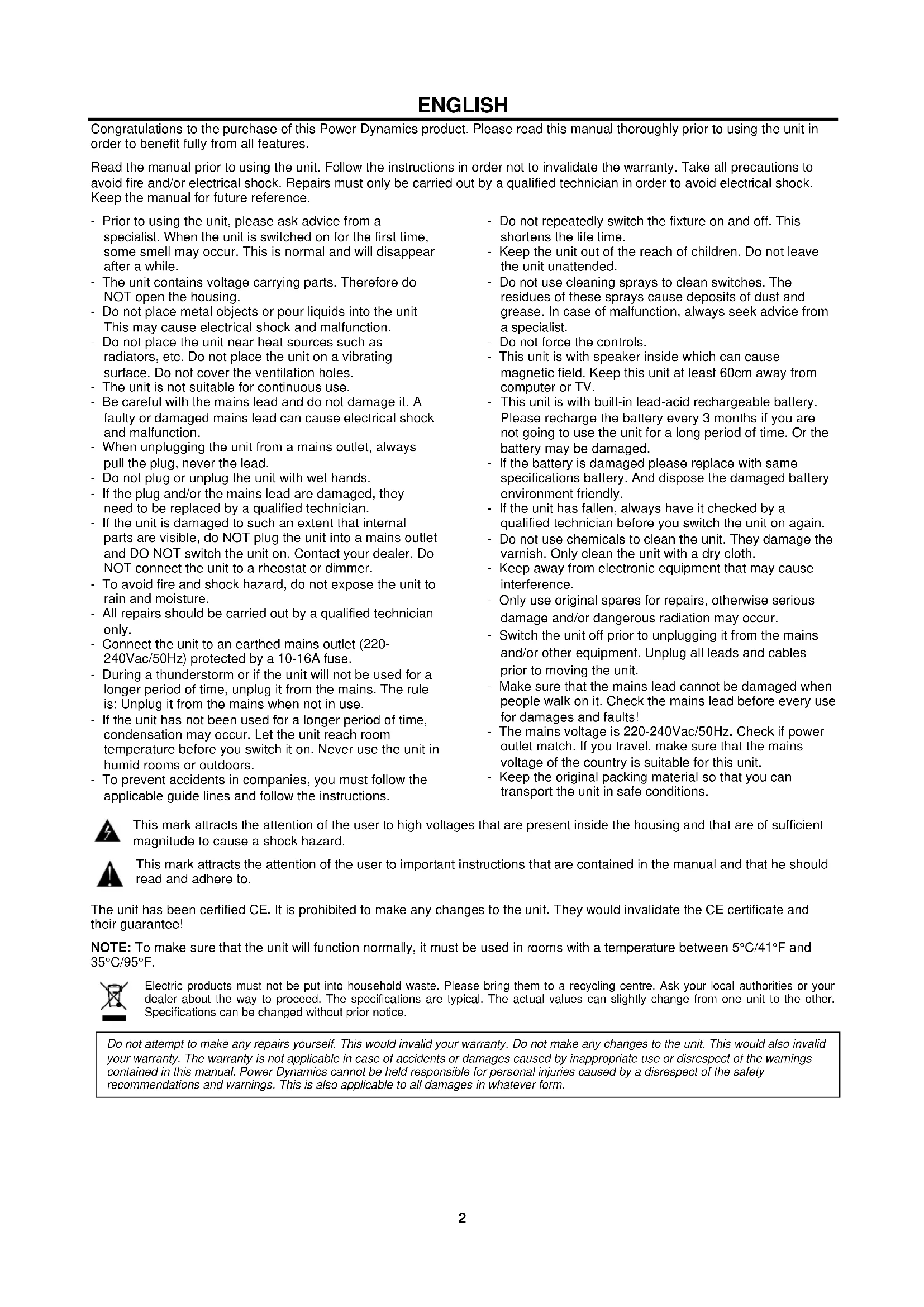 V1.02 ENGLISH Congratulations to the purchase of this Power Dynamics product. Please read this manual thoroughly prior to using the unit in order to benefit fully from all features. Read the manual prior to using the unit. Follow the instructions in order not to invalidate the warranty. Take all precautions to avoid fire and/or electrical shock. Repairs must only be carried out by a qualified technician in order to avoid electrical shock. Keep the manual for future reference. - Prior to using the unit, please ask advice from a specialist. When the unit is switched on for the first time, some smell may occur. This is normal and will disappear after a while. - The unit contains voltage carrying parts. Therefore do NOT open the housing. - Do not place metal objects or pour liquids into the unit This may cause electrical shock and malfunction. - Do not place the unit near heat sources such as radiators, etc. Do not place the unit on a vibrating surface. Do not cover the ventilation holes. - The unit is not suitable for continuous use. - Be careful with the mains lead and do not damage it. A faulty or damaged mains lead can cause electrical shock and malfunction. - When unplugging the unit from a mains outlet, always pull the plug, never the lead. - Do not plug or unplug the unit with wet hands. - If the plug and/or the mains lead are damaged, they need to be replaced by a qualified technician. - If the unit is damaged to such an extent that internal parts are visible, do NOT plug the unit into a mains outlet and DO NOT switch the unit on. Contact your dealer. Do NOT connect the unit to a rheostat or dimmer. - To avoid fire and shock hazard, do not expose the unit to rain and moisture. - All repairs should be carried out by a qualified technician only. - Connect the unit to an earthed mains outlet (220- 240Vac/50Hz) protected by a 10-16A fuse. - During a thunderstorm or if the unit will not be used for a longer period of time, unplug it from the mains. The rule is: Unplug it from the mains when not in use. - If the unit has not been used for a longer period of time, condensation may occur. Let the unit reach room temperature before you switch it on. Never use the unit in humid rooms or outdoors. - To prevent accidents in companies, you must follow the applicable guide lines and follow the instructions. - Do not repeatedly switch the fixture on and off. This shortens the life time. - Keep the unit out of the reach of children. Do not leave the unit unattended. - Do not use cleaning sprays to clean switches. The residues of these sprays cause deposits of dust and grease. In case of malfunction, always seek advice from a specialist. - Do not force the controls. - This unit is with speaker inside which can cause magnetic field. Keep this unit at least 60cm away from computer or TV. - This unit is with built-in lead-acid rechargeable battery. Please recharge the battery every 3 months if you are not going to use the unit for a long period of time. Or the battery may be damaged. - If the battery is damaged please replace with same specifications battery. And dispose the damaged battery environment friendly. - If the unit has fallen, always have it checked by a qualified technician before you switch the unit on again. - Do not use chemicals to clean the unit. They damage the varnish. Only clean the unit with a dry cloth. - Keep away from electronic equipment that may cause interference. - Only use original spares for repairs, otherwise serious damage and/or dangerous radiation may occur. - Switch the unit off prior to unplugging it from the mains and/or other equipment. Unplug all leads and cables prior to moving the unit. - Make sure that the mains lead cannot be damaged when people walk on it. Check the mains lead before every use for damages and faults! - The mains voltage is 220-240Vac/50Hz. Check if power outlet match. If you travel, make sure that the mains voltage of the country is suitable for this unit. - Keep the original packing material so that you can transport the unit in safe conditions. This mark attracts the attention of the user to high voltages that are present inside the housing and that are of sufficient magnitude to cause a shock hazard. This mark attracts the attention of the user to important instructions that are contained in the manual and that he should read and adhere to. The unit has been certified CE. It is prohibited to make any changes to the unit. They would invalidate the CE certificate and their guarantee! NOTE: To make sure that the unit will function normally, it must be used in rooms with a temperature between 5°C/41°F and 35°C/95°F. Electric products must not be put into household waste. Please bring them to a recycling centre. Ask your local authorities or your dealer about the way to proceed. The specifications are typical. The actual values can slightly change from one unit to the other. Specifications can be changed without prior notice.