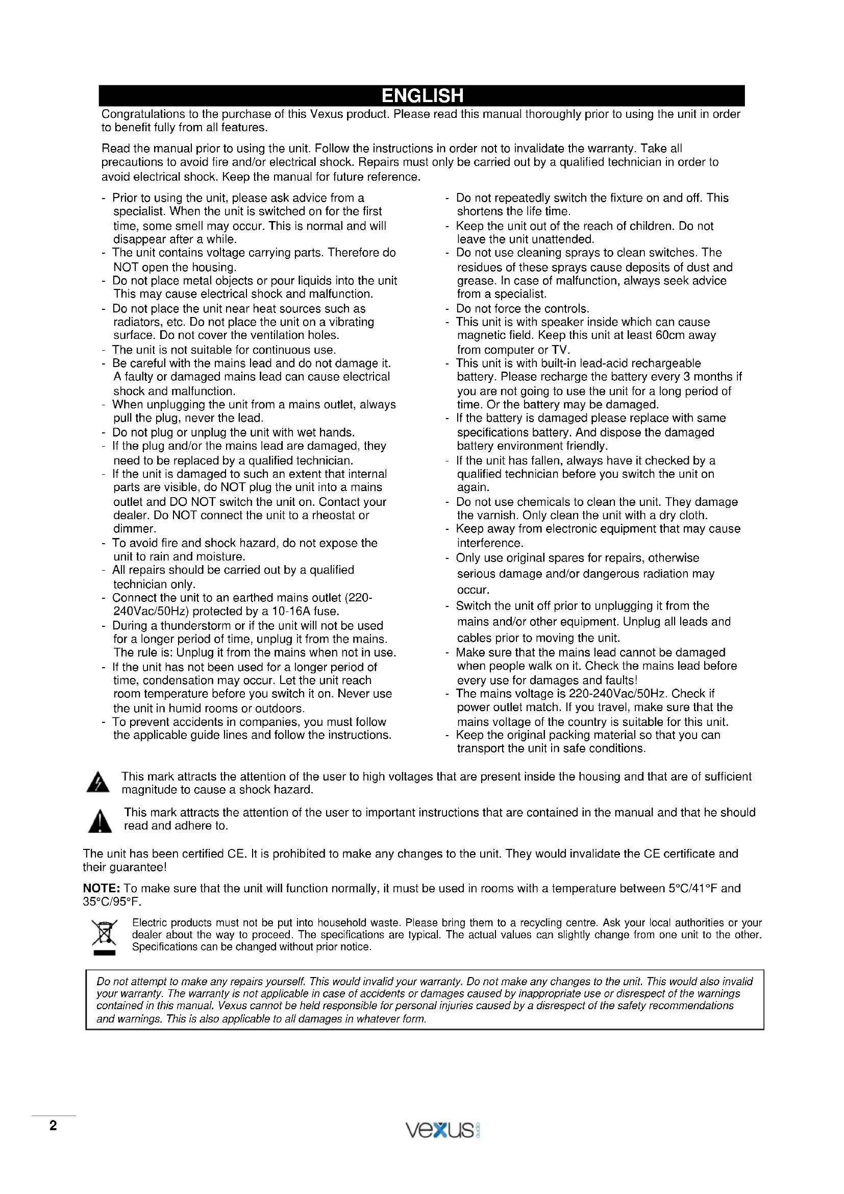 V1.02 ENGLISH Congratulations to the purchase of this Vexus product. Please read this manual thoroughly prior to using the unit in order to benefit fully from all features. Read the manual prior to using the unit. Follow the instructions in order not to invalidate the warranty. Take all precautions to avoid fire and/or electrical shock. Repairs must only be carried out by a qualified technician in order to avoid electrical shock. Keep the manual for future reference. - Prior to using the unit, please ask advice from a specialist. When the unit is switched on for the first time, some smell may occur. This is normal and will disappear after a while. - The unit contains voltage carrying parts. Therefore do NOT open the housing. - Do not place metal objects or pour liquids into the unit This may cause electrical shock and malfunction. - Do not place the unit near heat sources such as radiators, etc. Do not place the unit on a vibrating surface. Do not cover the ventilation holes. - The unit is not suitable for continuous use. - Be careful with the mains lead and do not damage it. A faulty or damaged mains lead can cause electrical shock and malfunction. - When unplugging the unit from a mains outlet, always pull the plug, never the lead. - Do not plug or unplug the unit with wet hands. - If the plug and/or the mains lead are damaged, they need to be replaced by a qualified technician. - If the unit is damaged to such an extent that internal parts are visible, do NOT plug the unit into a mains outlet and DO NOT switch the unit on. Contact your dealer. Do NOT connect the unit to a rheostat or dimmer. - To avoid fire and shock hazard, do not expose the unit to rain and moisture. - All repairs should be carried out by a qualified technician only. - Connect the unit to an earthed mains outlet (220- 240Vac/50Hz) protected by a 10-16A fuse. - During a thunderstorm or if the unit will not be used for a longer period of time, unplug it from the mains. The rule is: Unplug it from the mains when not in use. - If the unit has not been used for a longer period of time, condensation may occur. Let the unit reach room temperature before you switch it on. Never use the unit in humid rooms or outdoors. - To prevent accidents in companies, you must follow the applicable guide lines and follow the instructions. - Do not repeatedly switch the fixture on and off. This shortens the life time. - Keep the unit out of the reach of children. Do not leave the unit unattended. - Do not use cleaning sprays to clean switches. The residues of these sprays cause deposits of dust and grease. In case of malfunction, always seek advice from a specialist. - Do not force the controls. - This unit is with speaker inside which can cause magnetic field. Keep this unit at least 60cm away from computer or TV. - This unit is with built-in lead-acid rechargeable battery. Please recharge the battery every 3 months if you are not going to use the unit for a long period of time. Or the battery may be damaged. - If the battery is damaged please replace with same specifications battery. And dispose the damaged battery environment friendly. - If the unit has fallen, always have it checked by a qualified technician before you switch the unit on again. - Do not use chemicals to clean the unit. They damage the varnish. Only clean the unit with a dry cloth. - Keep away from electronic equipment that may cause interference. - Only use original spares for repairs, otherwise serious damage and/or dangerous radiation may occur. - Switch the unit off prior to unplugging it from the mains and/or other equipment. Unplug all leads and cables prior to moving the unit. - Make sure that the mains lead cannot be damaged when people walk on it. Check the mains lead before every use for damages and faults! - The mains voltage is 220-240Vac/50Hz. Check if power outlet match. If you travel, make sure that the mains voltage of the country is suitable for this unit. - Keep the original packing material so that you can transport the unit in safe conditions. This mark attracts the attention of the user to high voltages that are present inside the housing and that are of sufficient magnitude to cause a shock hazard. This mark attracts the attention of the user to important instructions that are contained in the manual and that he should read and adhere to. The unit has been certified CE. It is prohibited to make any changes to the unit. They would invalidate the CE certificate and their guarantee! NOTE: To make sure that the unit will function normally, it must be used in rooms with a temperature between 5°C/41°F and 35°C/95°F. Electric products must not be put into household waste. Please bring them to a recycling centre. Ask your local authorities or your dealer about the way to proceed. The specifications are typical. The actual values can slightly change from one unit to the other. Specifications can be changed without prior notice.
