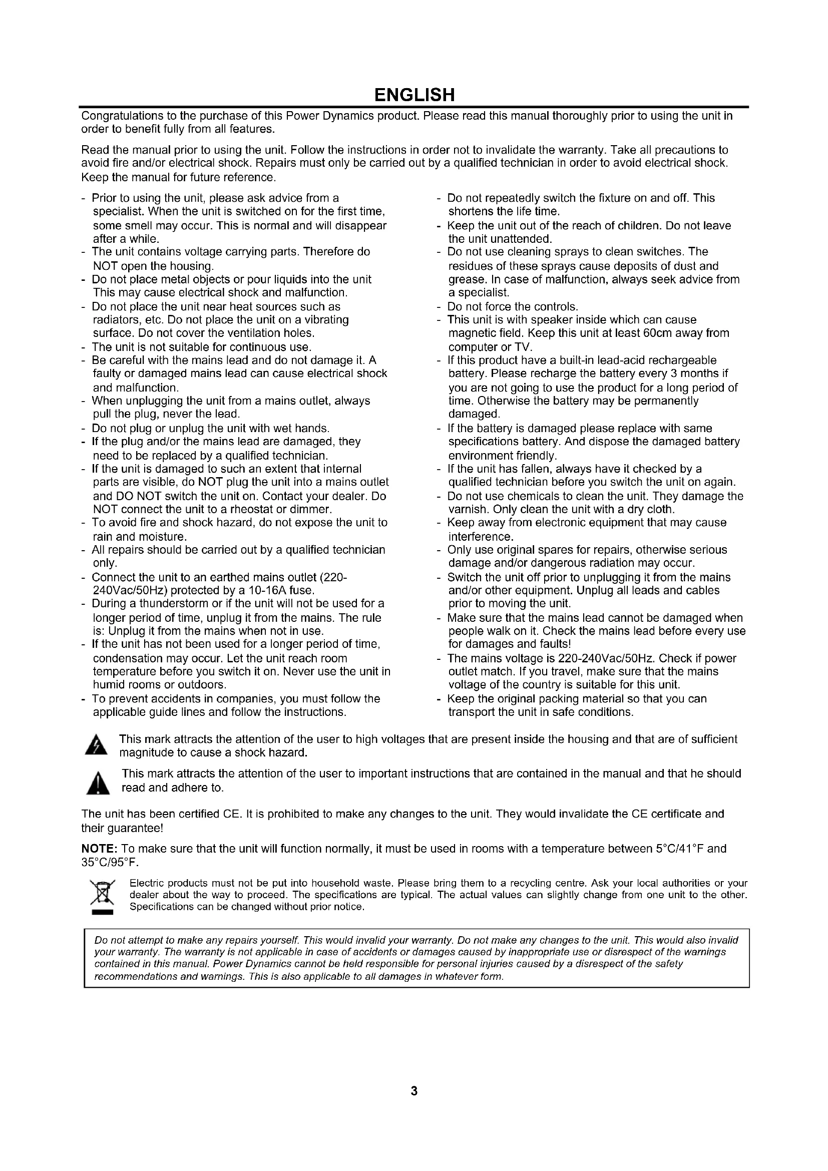 V1.323 ENGLISH Congratulations to the purchase of this Power Dynamics product. Please read this manual thoroughly prior to using the unit in order to benefit fully from all features. Read the manual prior to using the unit. Follow the instructions in order not to invalidate the warranty. Take all precautions to avoid fire and/or electrical shock. Repairs must only be carried out by a qualified technician in order to avoid electrical shock. Keep the manual for future reference. - Prior to using the unit, please ask advice from a specialist. When the unit is switched on for the first time, some smell may occur. This is normal and will disappear after a while. - The unit contains voltage carrying parts. Therefore do NOT open the housing. - Do not place metal objects or pour liquids into the unit This may cause electrical shock and malfunction. - Do not place the unit near heat sources such as radiators, etc. Do not place the unit on a vibrating surface. Do not cover the ventilation holes. - The unit is not suitable for continuous use. - Be careful with the mains lead and do not damage it. A faulty or damaged mains lead can cause electrical shock and malfunction. - When unplugging the unit from a mains outlet, always pull the plug, never the lead. - Do not plug or unplug the unit with wet hands. - If the plug and/or the mains lead are damaged, they need to be replaced by a qualified technician. - If the unit is damaged to such an extent that internal parts are visible, do NOT plug the unit into a mains outlet and DO NOT switch the unit on. Contact your dealer. Do NOT connect the unit to a rheostat or dimmer. - To avoid fire and shock hazard, do not expose the unit to rain and moisture. - All repairs should be carried out by a qualified technician only. - Connect the unit to an earthed mains outlet (220- 240Vac/50Hz) protected by a 10-16A fuse. - During a thunderstorm or if the unit will not be used for a longer period of time, unplug it from the mains. The rule is: Unplug it from the mains when not in use. - If the unit has not been used for a longer period of time, condensation may occur. Let the unit reach room temperature before you switch it on. Never use the unit in humid rooms or outdoors. - To prevent accidents in companies, you must follow the applicable guide lines and follow the instructions. - Do not repeatedly switch the fixture on and off. This shortens the life time. - Keep the unit out of the reach of children. Do not leave the unit unattended. - Do not use cleaning sprays to clean switches. The residues of these sprays cause deposits of dust and grease. In case of malfunction, always seek advice from a specialist. - Do not force the controls. - This unit is with speaker inside which can cause magnetic field. Keep this unit at least 60cm away from computer or TV. - If this product have a built-in lead-acid rechargeable battery. Please recharge the battery every 3 months if you are not going to use the product for a long period of time. Otherwise the battery may be permanently damaged. - If the battery is damaged please replace with same specifications battery. And dispose the damaged battery environment friendly. - If the unit has fallen, always have it checked by a qualified technician before you switch the unit on again. - Do not use chemicals to clean the unit. They damage the varnish. Only clean the unit with a dry cloth. - Keep away from electronic equipment that may cause interference. - Only use original spares for repairs, otherwise serious damage and/or dangerous radiation may occur. - Switch the unit off prior to unplugging it from the mains and/or other equipment. Unplug all leads and cables prior to moving the unit. - Make sure that the mains lead cannot be damaged when people walk on it. Check the mains lead before every use for damages and faults! - The mains voltage is 220-240Vac/50Hz. Check if power outlet match. If you travel, make sure that the mains voltage of the country is suitable for this unit. - Keep the original packing material so that you can transport the unit in safe conditions. This mark attracts the attention of the user to high voltages that are present inside the housing and that are of sufficient magnitude to cause a shock hazard. This mark attracts the attention of the user to important instructions that are contained in the manual and that he should read and adhere to. The unit has been certified CE. It is prohibited to make any changes to the unit. They would invalidate the CE certificate and their guarantee! NOTE: To make sure that the unit will function normally, it must be used in rooms with a temperature between 5°C/41°F and 35°C/95°F. Electric products must not be put into household waste. Please bring them to a recycling centre. Ask your local authorities or your dealer about the way to proceed. The specifications are typical. The actual values can slightly change from one unit to the other. Specifications can be changed without prior notice.