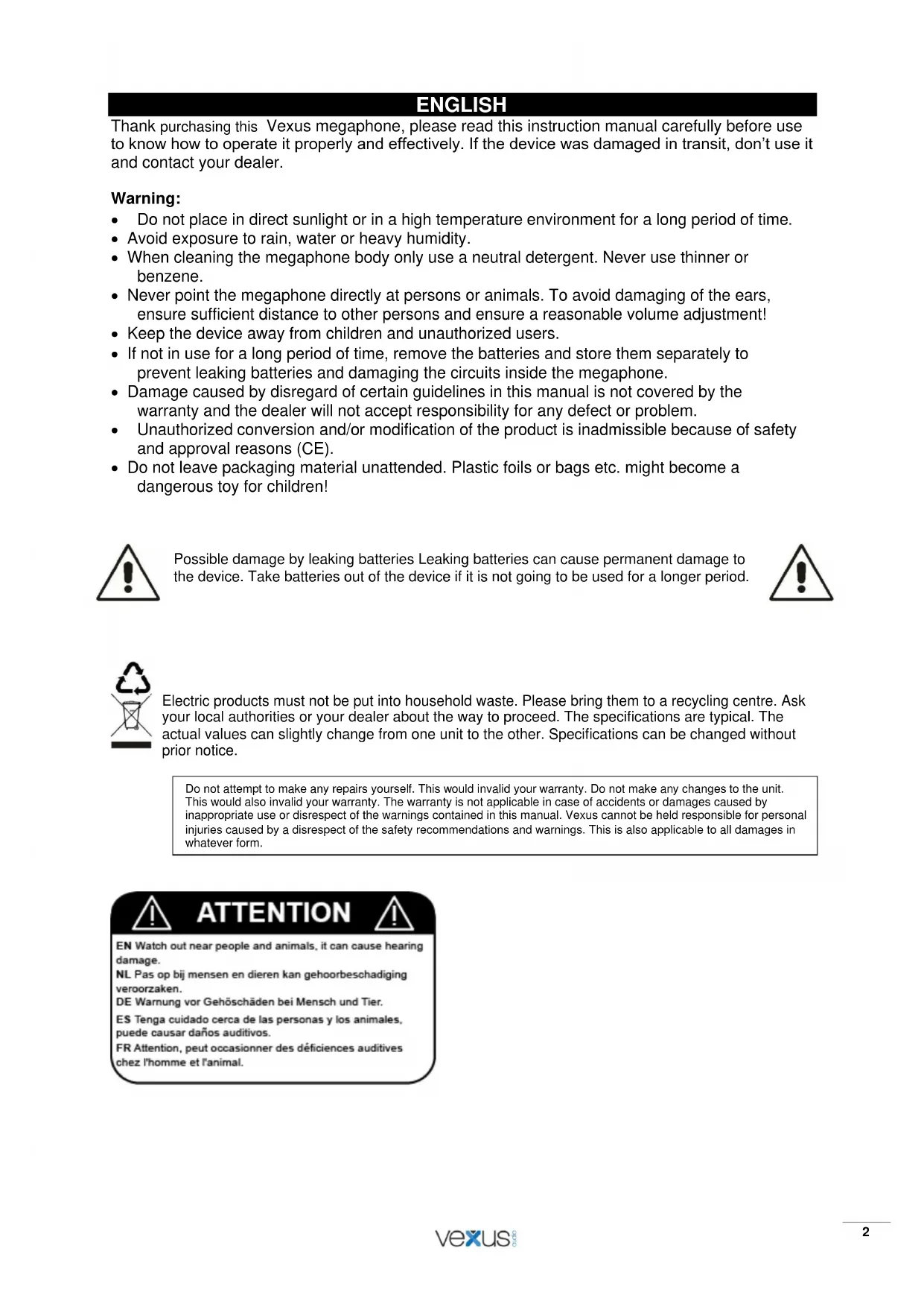 V1.02 ENGLISH Thank purchasing this Vexus megaphone, please read this instruction manual carefully before use to know how to operate it properly and effectively. If the device was damaged in transit, don’t use it and contact your dealer.