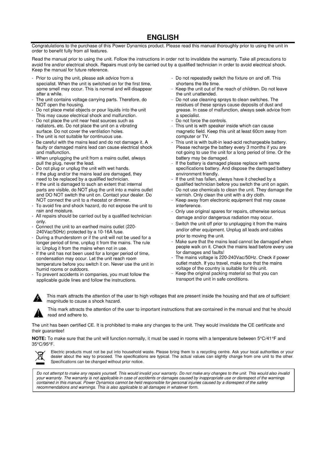 V1.1ENGLISH Congratulations to the purchase of this Power Dynamics product. Please read this manual thoroughly prior to using the unit in order to benefit fully from all features. Read the manual prior to using the unit. Follow the instructions in order not to invalidate the warranty. Take all precautions to avoid fire and/or electrical shock. Repairs must only be carried out by a qualified technician in order to avoid electrical shock. Keep the manual for future reference. - Prior to using the unit, please ask advice from a specialist. When the unit is switched on for the first time, some smell may occur. This is normal and will disappear after a while. - The unit contains voltage carrying parts. Therefore, do NOT open the housing. - Do not place metal objects or pour liquids into the unit This may cause electrical shock and malfunction. - Do not place the unit near heat sources such as radiators, etc. Do not place the unit on a vibrating surface. Do not cover the ventilation holes. - The unit is not suitable for continuous use. - Be careful with the mains lead and do not damage it. A faulty or damaged mains lead can cause electrical shock and malfunction. - When unplugging the unit from a mains outlet, always pull the plug, never the lead. - Do not plug or unplug the unit with wet hands. - If the plug and/or the mains lead are damaged, they need to be replaced by a qualified technician. - If the unit is damaged to such an extent that internal parts are visible, do NOT plug the unit into a mains outlet and DO NOT switch the unit on. Contact your dealer. Do NOT connect the unit to a rheostat or dimmer. - To avoid fire and shock hazard, do not expose the unit to rain and moisture. - All repairs should be carried out by a qualified technician only. - Connect the unit to an earthed mains outlet (220- 240Vac/50Hz) protected by a 10-16A fuse. - During a thunderstorm or if the unit will not be used for a longer period of time, unplug it from the mains. The rule is: Unplug it from the mains when not in use. - If the unit has not been used for a longer period of time, condensation may occur. Let the unit reach room temperature before you switch it on. Never use the unit in humid rooms or outdoors. - To prevent accidents in companies, you must follow the applicable guide lines and follow the instructions. - Do not repeatedly switch the fixture on and off. This shortens the life time. - Keep the unit out of the reach of children. Do not leave the unit unattended. - Do not use cleaning sprays to clean switches. The residues of these sprays cause deposits of dust and grease. In case of malfunction, always seek advice from a specialist. - Do not force the controls. - This unit is with speaker inside which can cause magnetic field. Keep this unit at least 60cm away from computer or TV. - This unit is with built-in lead-acid rechargeable battery. Please recharge the battery every 3 months if you are not going to use the unit for a long period of time. Or the battery may be damaged. - If the battery is damaged please replace with same specifications battery. And dispose the damaged battery environment friendly. - If the unit has fallen, always have it checked by a qualified technician before you switch the unit on again. - Do not use chemicals to clean the unit. They damage the varnish. Only clean the unit with a dry cloth. - Keep away from electronic equipment that may cause interference. - Only use original spares for repairs, otherwise serious damage and/or dangerous radiation may occur. - Switch the unit off prior to unplugging it from the mains and/or other equipment. Unplug all leads and cables prior to moving the unit. - Make sure that the mains lead cannot be damaged when people walk on it. Check the mains lead before every use for damages and faults! - The mains voltage is 220-240Vac/50Hz. Check if power outlet match. If you travel, make sure that the mains voltage of the country is suitable for this unit. - Keep the original packing material so that you can transport the unit in safe conditions. This mark attracts the attention of the user to high voltages that are present inside the housing and that are of sufficient magnitude to cause a shock hazard. This mark attracts the attention of the user to important instructions that are contained in the manual and that he should read and adhere to. The unit has been certified CE. It is prohibited to make any changes to the unit. They would invalidate the CE certificate and their guarantee! NOTE: To make sure that the unit will function normally, it must be used in rooms with a temperature between 5°C/41°F and 35°C/95°F. Electric products must not be put into household waste. Please bring them to a recycling centre. Ask your local authorities or your dealer about the way to proceed. The specifications are typical. The actual values can slightly change from one unit to the other. Specifications can be changed without prior notice.