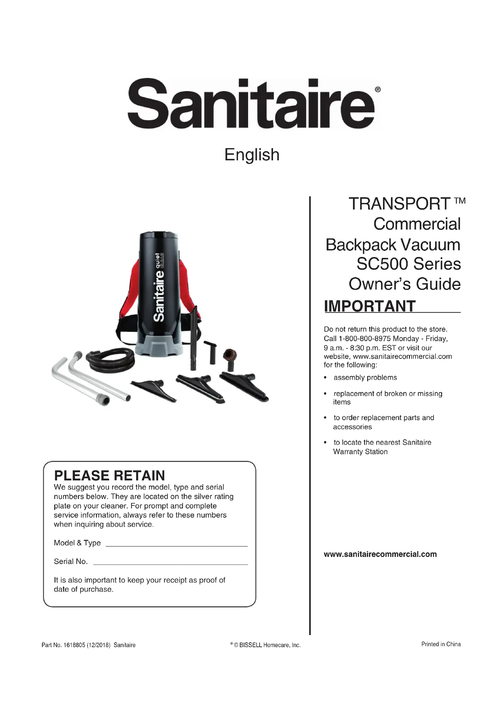 Commercial Backpack Vacuum SC500 Series Owner’s Guide IMPORTANT Do not return this product to the store. Call 1-800-800-8975 Monday - Friday, 9 a.m. - 8:30 p.m. EST or visit ourwebsite, www.sanitairecommercial.comfor the following:• assemblyproblems• replacementofbrokenormissingitems• toorderreplacementpartsandaccessories• tolocatethenearestSanitaireWarranty Station www.sanitairecommercial.com PLEASE RETAIN We suggest you record the model, type and serial numbers below. They are located on the silver rating plate on your cleaner. For prompt and complete service information, always refer to these numbers when inquiring about service. Model & Type _________________________________ Serial No. ____________________________________ It is also important to keep your receipt as proof of date of purchase. Part No. 1618805 (12/2018) Sanitaire © BISSELL Homecare, Inc.Printed in ChinaTo reduce the risk of re, electric shock or injury: