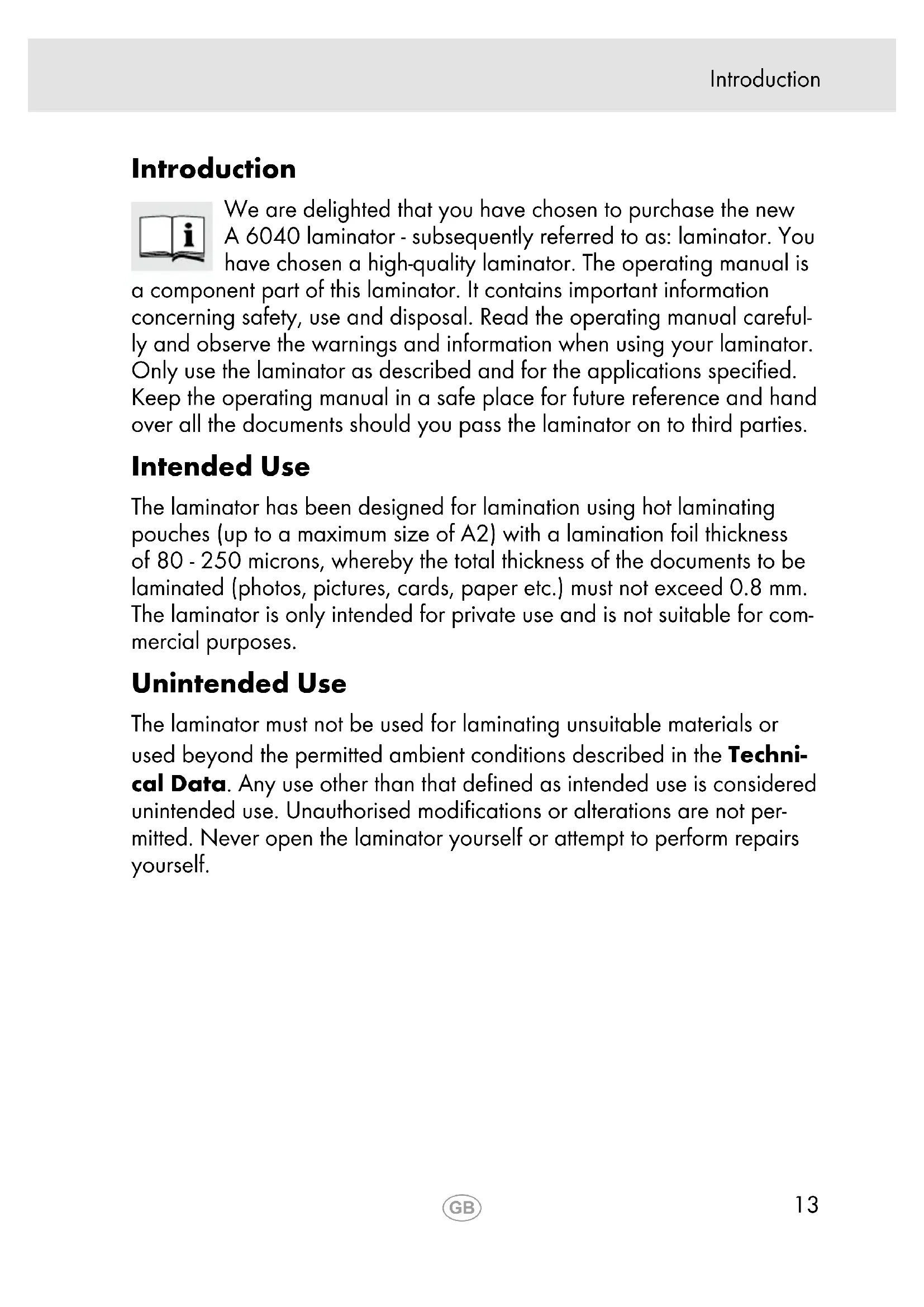 - Guarantee Introduction Introduction We are delighted that you have chosen to purchase the new A 6040 laminator - subsequently referred to as: laminator. You have chosen a high-quality laminator. The operating manual is a component part of this laminator. It contains important information concerning safety, use and disposal. Read the operating manual careful- ly and observe the warnings and information when using your laminator. Only use the laminator as described and for the applications specied. Keep the operating manual in a safe place for future reference and hand over all the documents should you pass the laminator on to third parties. Intended Use The laminator has been designed for lamination using hot laminating pouches (up to a maximum size of A2) with a lamination foil thickness of 80 - 250 microns, whereby the total thickness of the documents to be laminated (photos, pictures, cards, paper etc.) must not exceed 0.8 mm. The laminator is only intended for private use and is not suitable for com- mercial purposes. Unintended Use The laminator must not be used for laminating unsuitable materials or used beyond the permitted ambient conditions described in the Techni- cal Data. Any use other than that dened as intended use is considered unintended use. Unauthorised modications or alterations are not per- mitted. Never open the laminator yourself or attempt to perform repairs yourself. G14 For Your Safety For Your Safety Read and observe all the safety information to protect yourself and the environment from any harm. WARNING! Risk of injury through electric shock. Improper handling of the laminator can lead to an electric shock. Unau- thorised modications or alterations to the laminator are not permitted. Repairs may only be carried out by properly trained specialists. Ensure that the laminator is set up near an easily accessible power socket so that the laminator can be discon- nected from the power supply in an emergency. Never take hold of the laminator with wet hands. Avoid any contact with water. The laminator may only be used in dry, indoor areas. WARNING! Risk of suocation through small parts, packag- ing materials or protective foils. Children can swallow small parts, packaging materials and protective foils. Keep children away from the laminator and its packaging materials. WARNING! The laminator can be used by children from the age of eight and by persons with restricted physical, sensory or mental capabilities or a lack of experience and/or knowledge when they are under supervision or have been instructed on the safe use of the laminator and understand the risks involved if it is not used properly. Do not let children play with the laminator. Children must not be allowed to complete any cleaning or service work on the device without adequate supervision. WARNING! Risk of injury through the feed mechanism. Loose items could get caught in the infeed and cause injuries. Keep ngers, hair, scarves, ties, jewellery etc. well away from the infeed. WARNING! Risk to health through harmful vapours. Vapours which are damaging to health can develop during lamination. Always ensure good ventilation during lamination. G15 For Your Safety CAUTION! Risk of burns through hot machine surface! During the laminating process, the machine surface heats up. Do not touch the machine surface during the laminating operation. Wait a few minutes after laminating until the laminator has cooled down before you touch it. CAUTION! Risk of burns through hot laminating pouch. When the laminating pouch is ejected after lamination, it is extremely hot. Only remove the ejected lamination pouch holding it at the cooled end. CAUTION! Risk of burns through hot residual laminated material. After cleaning, very hot residual laminated material is stuck to the ejected paper. Only remove the ejected paper holding it at the cooled end. CAUTION! Risk of tripping through improperly laid cable. Lay cables in such a way that nobody can trip over them. Make sure the power plug and cable cannot be damaged. Ensure that the laminator is set up near an easily accessible power socket so that it can be disconnected from the power supply in an emergency. ATTENTION! Risk of property damage. Avoid exposing the laminator to environmental inuences such as smoke, dust, vibra- tion, chemicals, moisture, heat or direct sunlight. Only use the laminator in indoor areas and within the ambient conditions permitted and stipulated in "Technical Data". G16 General View General View The following gure shows the laminator in detail. p. 2313