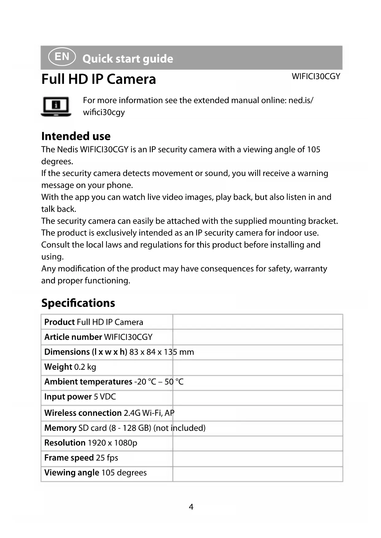 Quick start guide Full HD IP Camera WIFICI30CGY For more information see the extended manual online: ned.is/ wici30cgy Intended use The Nedis WIFICI30CGY is an IP security camera with a viewing angle of 105 degrees. If the security camera detects movement or sound, you will receive a warning message on your phone. With the app you can watch live video images, play back, but also listen in and talk back. The security camera can easily be attached with the supplied mounting bracket. The product is exclusively intended as an IP security camera for indoor use. Consult the local laws and regulations for this product before installing and using. Any modication of the product may have consequences for safety, warranty and proper functioning. Specications Product Full HD IP Camera Article number WIFICI30CGY Dimensions (l x w x h) 83 x 84 x 135 mm Weight 0.2 kg Ambient temperatures -20 °C – 50 °C Input power 5 VDC Wireless connection 2.4G Wi-Fi, AP Memory SD card (8 - 128 GB) (not included) Resolution 1920 x 1080p Frame speed 25 fps Viewing angle 105 degrees WIFICI30CGY_MAN_COMP_0820_print_(20452 1422)_v01.indd 4WIFICI30CGY_MAN_COMP_0820_print_(20452 1422)_v01.indd 4 16-9-2020 09:39:2016-9-2020 09:39:205 Max. radio transmit power 18.5 dBm Pan (horizontal) 355 degrees Tilt (vertical) 60 degrees Antenna gain 3 dBi Frequency range 2412 - 2472 MHz Main parts (image A) 1 Status indicator LED 2 Camera lens 3 Microphone 4 SD card slot 5 Reset button 6 Speaker 7 Push-to-talk (PTT) 8 Micro USB port 9 Reset pin q Mounting bracket w Micro USB cable e USB power adapter Safety instructions