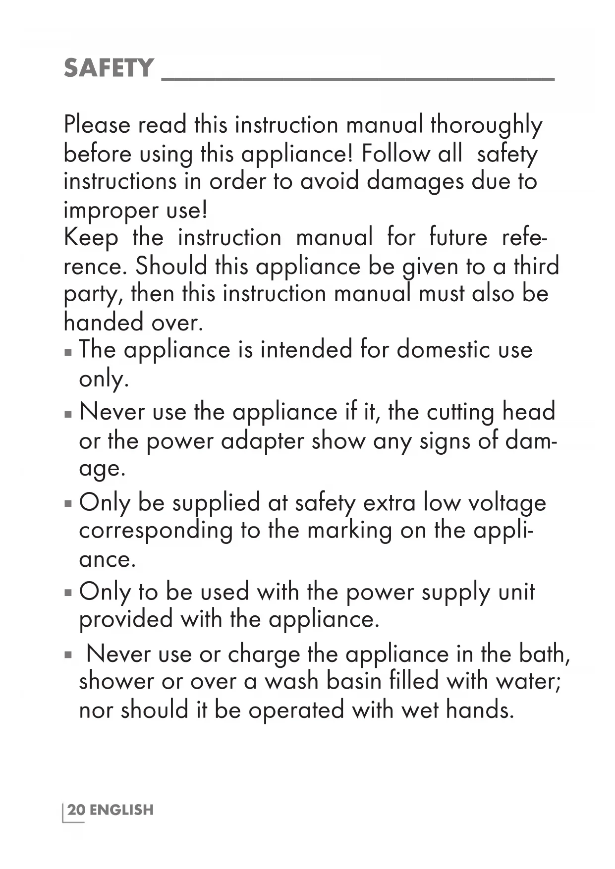 SAFETY _____________________________ Please read this instruction manual thoroughly before using this appliance! Follow all safety instructions in order to avoid damages due to improper use! Keep the instruction manual for future refe- rence. Should this appliance be given to a third party, then this instruction manual must also be handed over.