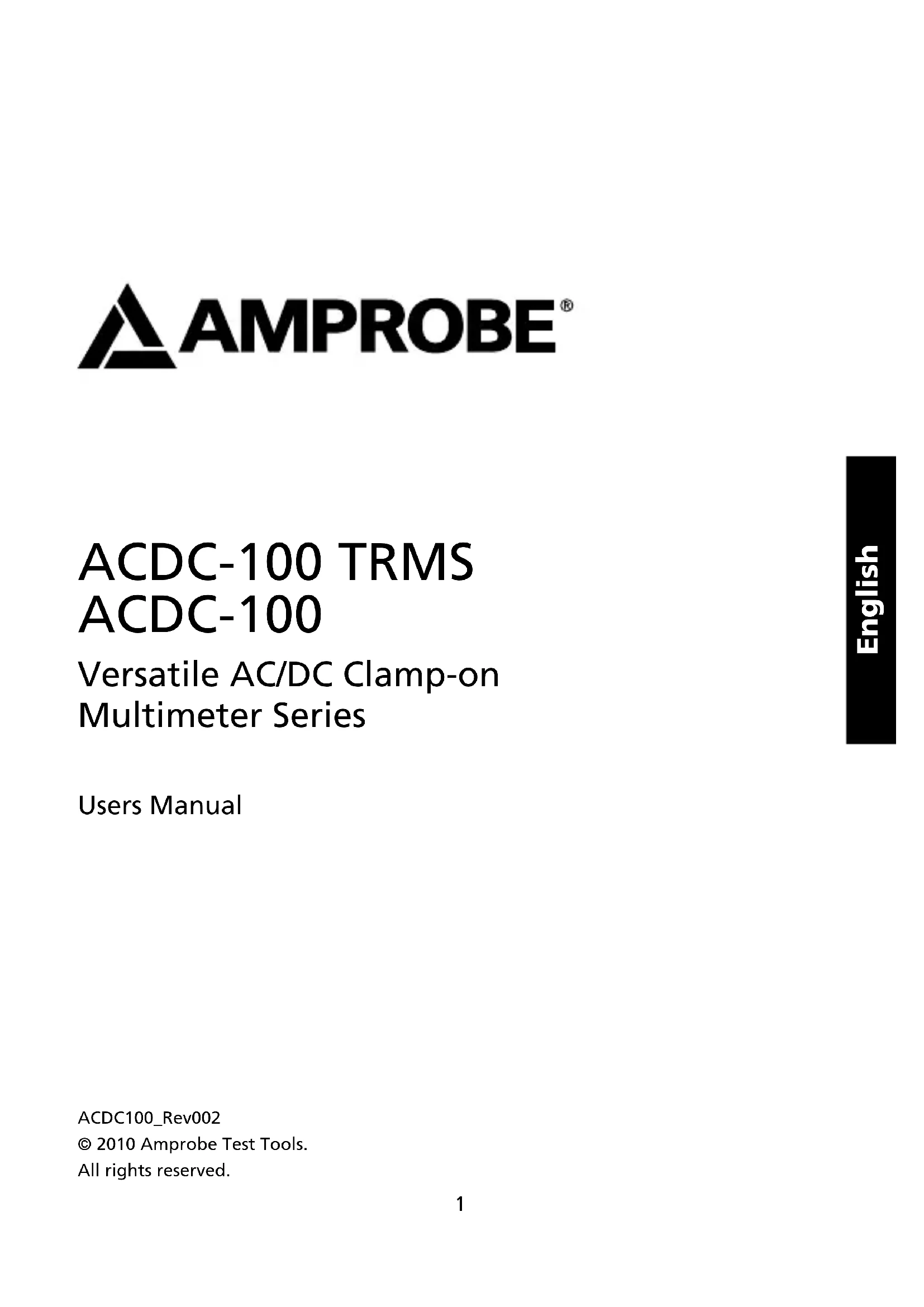ACDC-100 TRMS ACDC-100 Versatile AC/DC Clamp-on Multimeter Series Users Manual Mode d’emploi• Bedienungshandbuch• Manuale d’Uso• Manual de uso• Användarhandbok•1 English ACDC-100 TRMS ACDC-100 Versatile AC/DC Clamp-on Multimeter Series Users Manual ACDC100_Rev002© 2010 Amprobe Test Tools.All rights reserved.2 Limited Warranty and Limitation of Liability Your Amprobe product will be free from defects in material and workmanship for 1 year from the date of purchase. This warranty does not cover fuses, disposable batteries or damage from accident, neglect, misuse, alteration, contamination, or abnormal conditions of operation or handling. Resellers are not authorized to extend any other warranty on Amprobe’s behalf. To obtain service during the warranty period, return the product with proof of purchase to an authorized Amprobe Test Tools Service Center or to an Amprobe dealer or distributor. See Repair Section for details. THIS WARRANTY IS YOUR ONLY REMEDY. ALL OTHER WARRANTIES - WHETHER EXPRESS, IMPLIED OR STAUTORY - INCLUDING IMPLIED WARRANTIES OF FITNESS FOR A PARTICULAR PURPOSE OR MERCHANTABILITY, ARE HEREBY DISCLAIMED. MANUFACTURER SHALL NOT BE LIABLE FOR ANY SPECIAL, INDIRECT, INCIDENTAL OR CONSEQUENTIAL DAMAGES OR LOSSES, ARISING FROM ANY CAUSE OR THEORY. Since some states or countries do not allow the exclusion or limitation of an implied warranty or of incidental or consequential damages, this limitation of liability may not apply to you. Repair All test tools returned for warranty or non-warranty repair or for calibration should be accompanied by the following: your name, company’s name, address, telephone number, and proof of purchase. Additionally, please include a brief description of the problem or the service requested and include the test leads with the meter. Non-warranty repair or replacement charges should be remitted in the form of a check, a money order, credit card with expiration date, or a purchase order made payable to Amprobe