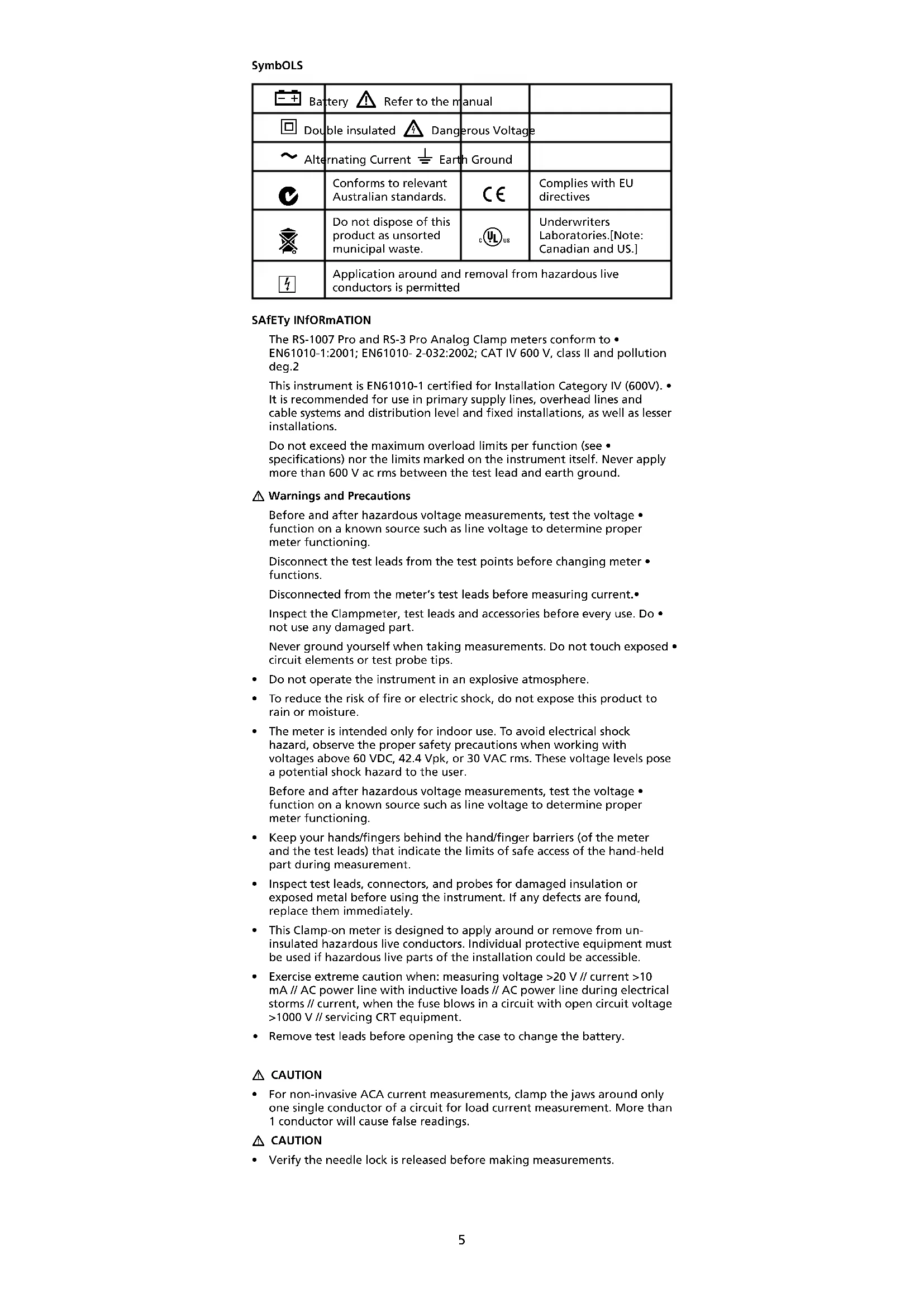 Application around and removal from hazardous live conductors is permitted SAfETy INfORmATION The RS-1007 Pro and RS-3 Pro Analog Clamp meters conform to • EN61010-1:2001; EN61010- 2-032:2002; CAT IV 600 V, class II and pollution deg.2 This instrument is EN61010-1 certified for Installation Category IV (600V). • It is recommended for use in primary supply lines, overhead lines and cable systems and distribution level and fixed installations, as well as lesser installations. Do not exceed the maximum overload limits per function (see • specifications) nor the limits marked on the instrument itself. Never apply more than 600 V ac rms between the test lead and earth ground. Warnings and Precautions Before and after hazardous voltage measurements, test the voltage • function on a known source such as line voltage to determine proper meter functioning. Disconnect the test leads from the test points before changing meter • functions. Disconnected from the meter’s test leads before measuring current.• Inspect the Clampmeter, test leads and accessories before every use. Do • not use any damaged part. Never ground yourself when taking measurements. Do not touch exposed • circuit elements or test probe tips. Do not operate the instrument in an explosive atmosphere.• To reduce the risk of fire or electric shock, do not expose this product to • rain or moisture. The meter is intended only for indoor use. To avoid electrical shock • hazard, observe the proper safety precautions when working with voltages above 60 VDC, 42.4 Vpk, or 30 VAC rms. These voltage levels pose a potential shock hazard to the user. Before and after hazardous voltage measurements, test the voltage • function on a known source such as line voltage to determine proper meter functioning. Keep your hands/fingers behind the hand/finger barriers (of the meter • and the test leads) that indicate the limits of safe access of the hand-held part during measurement. Inspect test leads, connectors, and probes for damaged insulation or • exposed metal before using the instrument. If any defects are found, replace them immediately. This Clamp-on meter is designed to apply around or remove from un-• insulated hazardous live conductors. Individual protective equipment must be used if hazardous live parts of the installation could be accessible. Exercise extreme caution when: measuring voltage >20 V // current >10 • mA // AC power line with inductive loads // AC power line during electrical storms // current, when the fuse blows in a circuit with open circuit voltage >1000 V // servicing CRT equipment. Remove test leads before opening the case to change the battery.• CAUTION For non-invasive ACA current measurements, clamp the jaws around only • one single conductor of a circuit for load current measurement. More than 1 conductor will cause false readings. CAUTION Verify the needle lock is released before making measurements.•6
