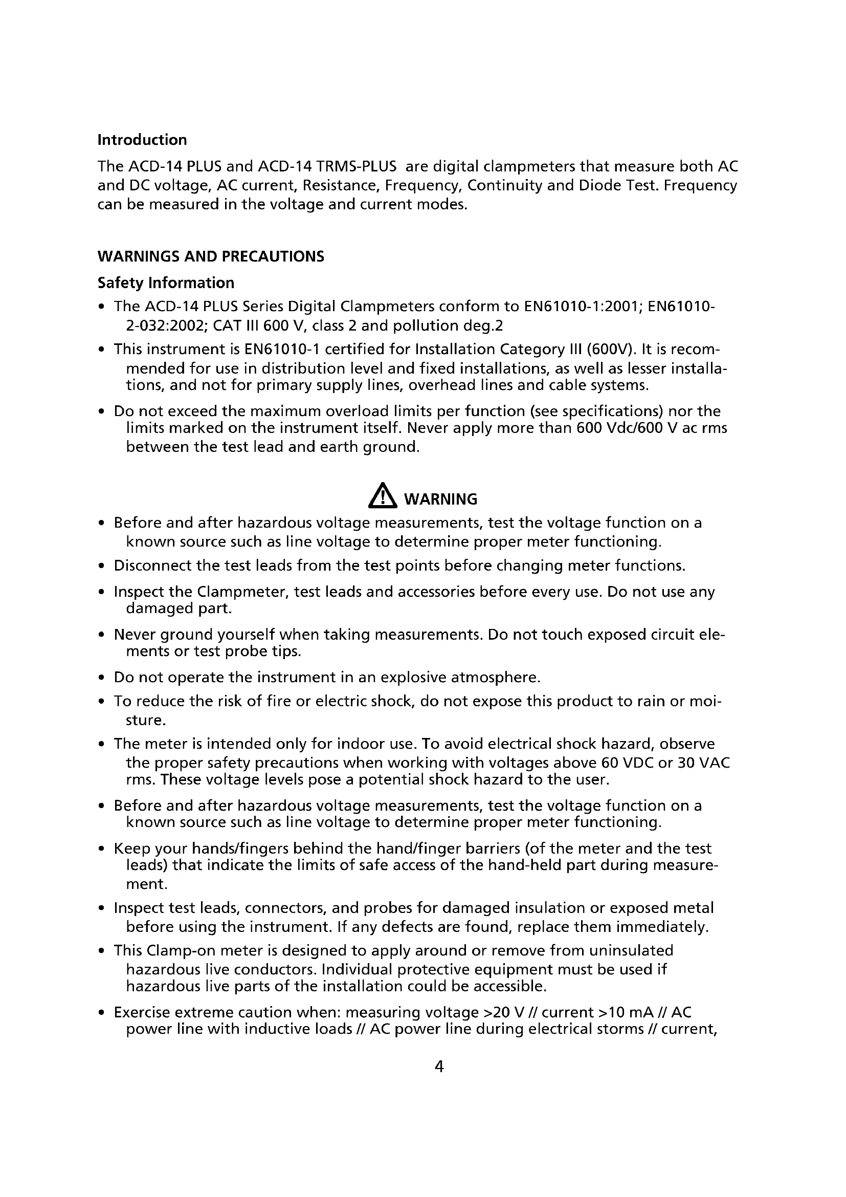 Do not dispose of this product as unsorted municipal waste4 Introduction The ACD-14 PLUS and ACD-14 TRMS-PLUS are digital clampmeters that measure both AC and DC voltage, AC current, Resistance, Frequency, Continuity and Diode Test. Frequency can be measured in the voltage and current modes.
