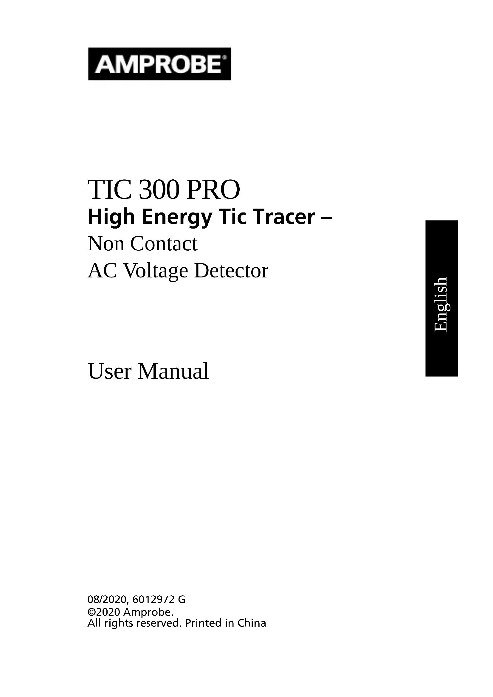 TIC 300 PRO High Energy Tic Tracer – Non Contact AC Voltage Detector User ManualTIC 300 PRO High Energy Tic Tracer – Non Contact AC Voltage Detector User Manual 08/2020, 6012972 G ©2020 Amprobe. All rights reserved. Printed in China EnglishLimited Warranty and Limitation of Liability Your Amprobe product will be free from defects in material and workmanship for 1 year from the date of purchase. This warranty does not cover fuses, disposable batteries or damage from accident, neglect, misuse, alteration, contamination, or abnormal conditions of operation or handling. Resellers are not authorized to extend any other warranty on Amprobe’s behalf. To obtain service during the warranty period, return the product with proof of purchase to an authorized Amprobe Test Tools Service Center or to an Amprobe dealer or distributor. See Repair Section for details. THIS WARRANTY IS YOUR ONLY REMEDY. ALL OTHER WARRANTIES - WHETHER EXPRESS, IMPLIED OR STAUTORY - INCLUDING IMPLIED WARRANTIES OF FITNESS FOR A PARTICULAR PURPOSE OR MERCHANTABILITY, ARE HEREBY DISCLAIMED. MANUFACTURER SHALL NOT BE LIABLE FOR ANY
