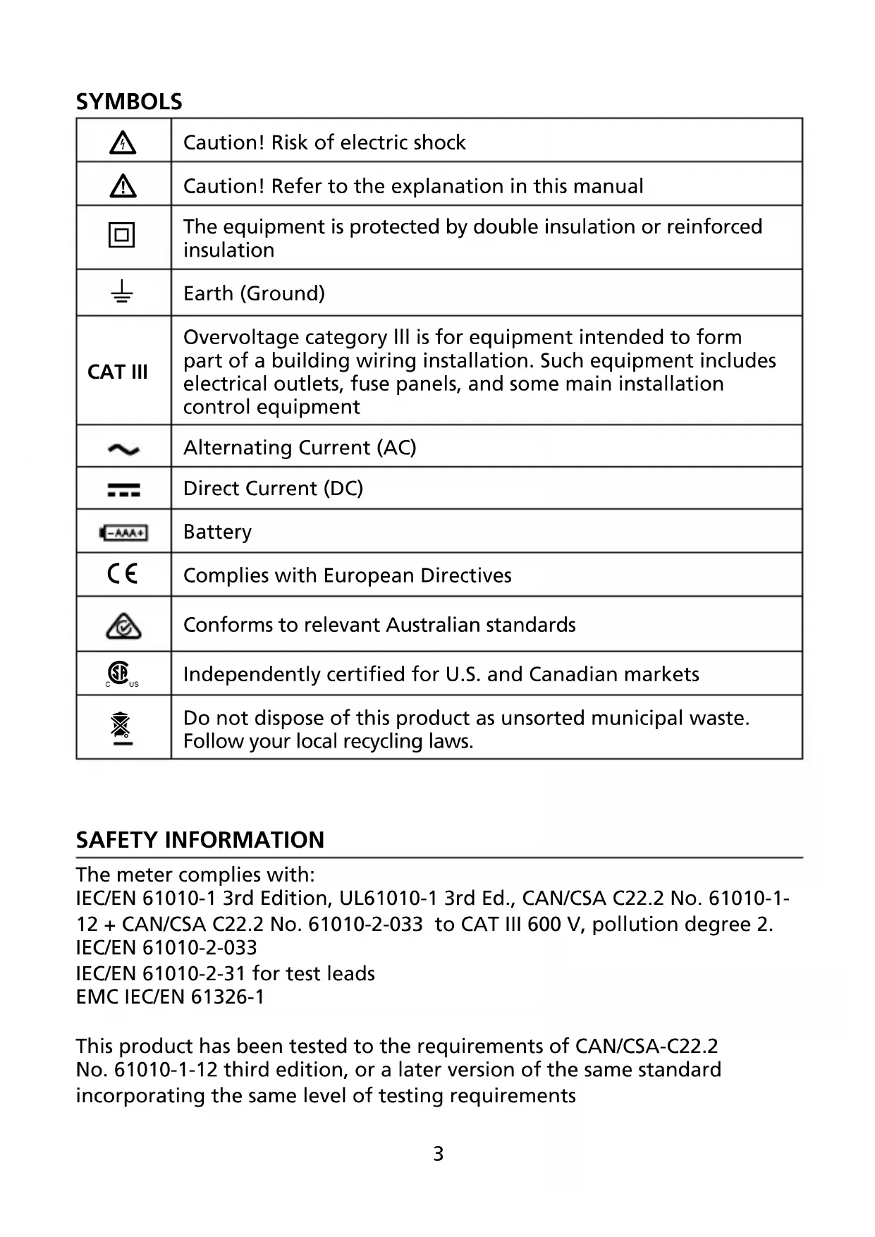 Caution! Risk of electric shock Caution! Refer to the explanation in this manual The equipment is protected by double insulation or reinforced insulation Earth (Ground)CAT IIIOvervoltage category lll is for equipment intended to form part of a building wiring installation. Such equipment includes electrical outlets, fuse panels, and some main installation control equipmentAlternating Current (AC)Direct Current (DC)Battery Complies with European DirectivesConforms to relevant Australian standards Independently certified for U.S. and Canadian markets Do not dispose of this product as unsorted municipal waste. Follow your local recycling laws. SAFETY INFORMATION The meter complies with:IEC/EN 61010-1 3rd Edition, UL61010-1 3rd Ed., CAN/CSA C22.2 No. 61010-1-12 + CAN/CSA C22.2 No. 61010-2-033 to CAT III 600 V, pollution degree 2.IEC/EN 61010-2-033IEC/EN 61010-2-31 for test leadsEMC IEC/EN 61326-1This product has been tested to the requirements of CAN/CSA-C22.2 No. 61010-1-12 third edition, or a later version of the same standard incorporating the same level of testing requirements4 CENELEC Directives The instruments conforms to CENELEC low voltage directive 2014/35/EU and electromagnetic compatibility directive 2014/30/EU W Warning To prevent possible electrical shock, fire, or personal injury: