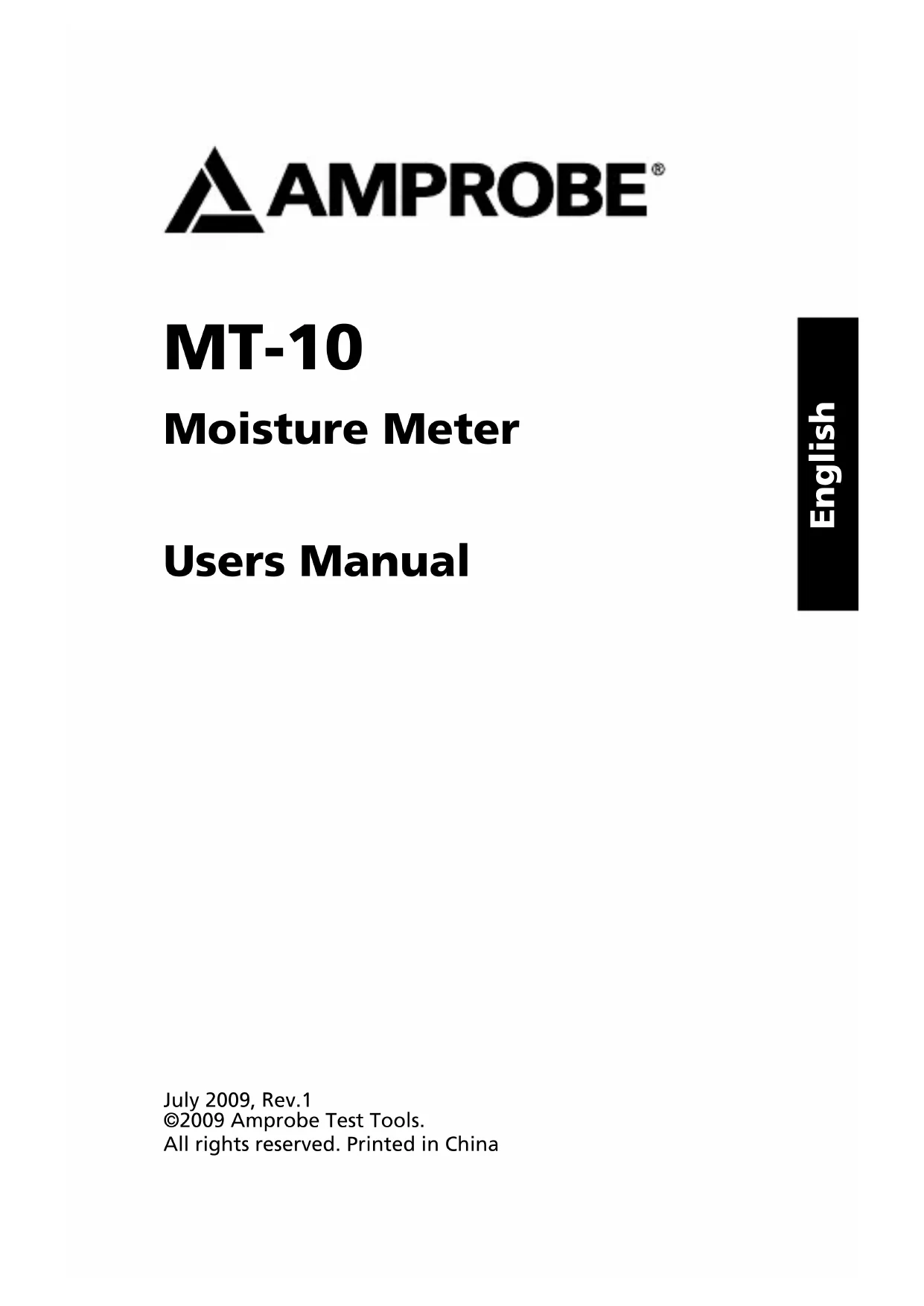 - Manual de uso MT-10 Moisture MeterMT-10 Moisture Meter Users Manual July 2009, Rev.1 ©2009 Amprobe Test Tools. All rights reserved. Printed in China EnglishLimited Warranty and Limitation of Liability Your Amprobe product will be free from defects in material and workmanship for 1 year from the date of purchase. This warranty does not cover fuses, disposable batteries or damage from accident, neglect, misuse, alteration, contamination, or abnormal conditions of operation or handling. Resellers are not authorized to extend any other warranty on Amprobe’s behalf. To obtain service during the warranty period, return the product with proof of purchase to an authorized Amprobe Test Tools Service Center or to an Amprobe dealer or distributor. See Repair Section for details. THIS WARRANTY IS YOUR ONLY REMEDY. ALL OTHER WARRANTIES - WHETHER EXPRESS, IMPLIED OR STAUTORY - INCLUDING IMPLIED WARRANTIES OF FITNESS FOR A PARTICULAR PURPOSE OR MERCHANTABILITY, ARE HEREBY DISCLAIMED. MANUFACTURER SHALL NOT BE LIABLE FOR ANY