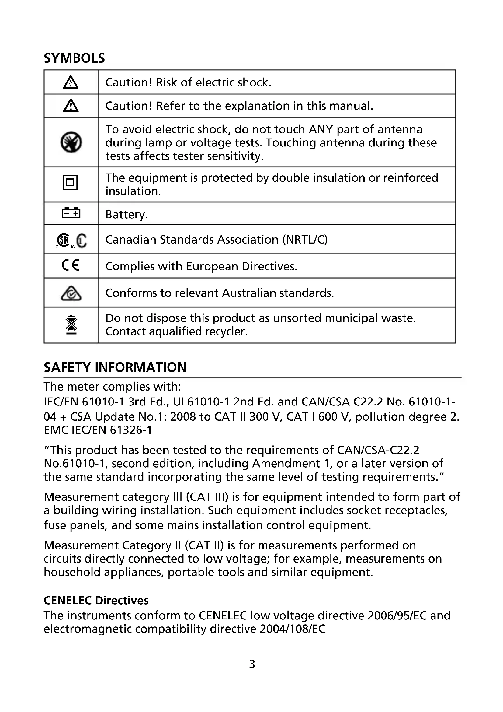 Do not dispose this product as unsorted municipal waste. Contact aqualified recycler. SAFETY INFORMATION The meter complies with: IEC/EN 61010-1 3rd Ed., UL61010-1 2nd Ed. and CAN/CSA C22.2 No. 61010-1- 04 + CSA Update No.1: 2008 to CAT II 300 V, CAT I 600 V, pollution degree 2.