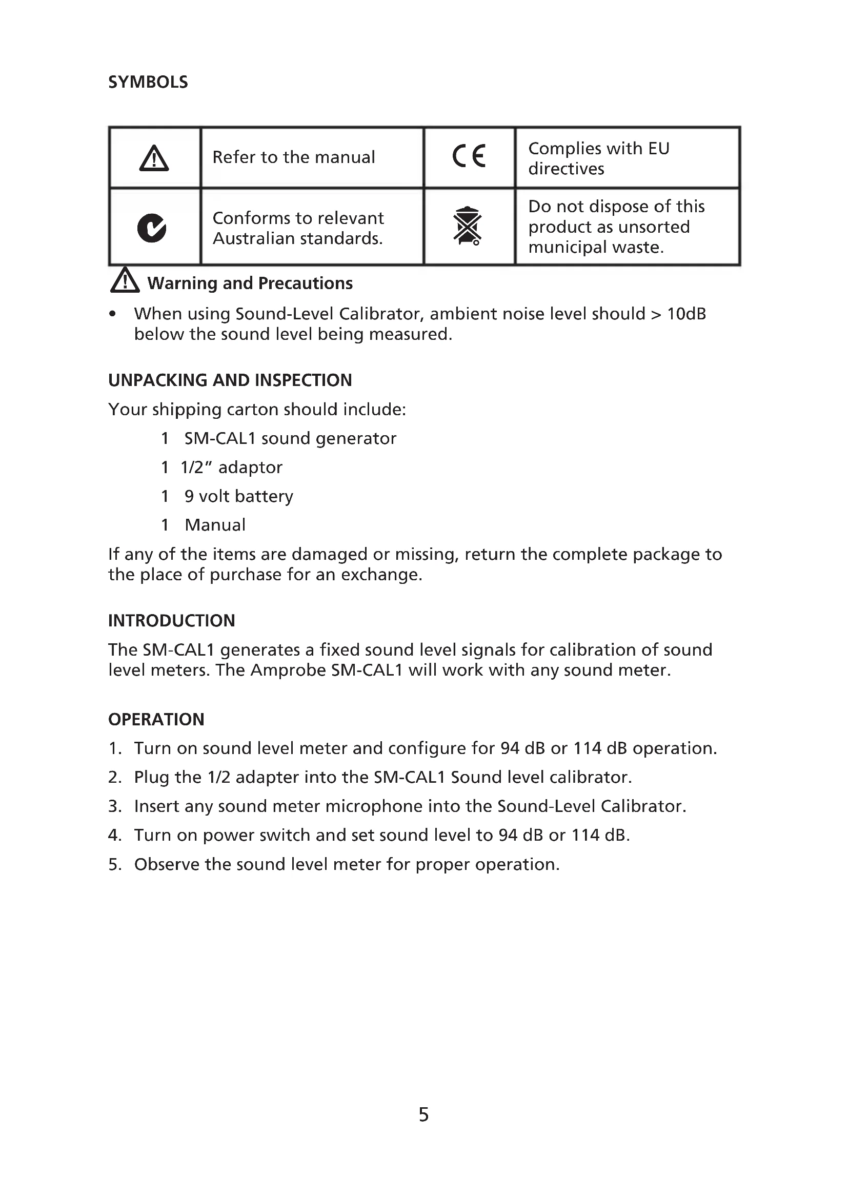 Your shipping carton should include: 1 SM-CAL1 sound generator 1 1/2” adaptor 1 9 volt battery 1 Manual If any of the items are damaged or missing, return the complete package to the place of purchase for an exchange. INTRODUCTION The SM-CAL1 generates a fixed sound level signals for calibration of sound level meters. The Amprobe SM-CAL1 will work with any sound meter. OPERATION Turn on sound level meter and configure for 94 dB or 114 dB operation. Plug the 1/2 adapter into the SM-CAL1 Sound level calibrator. Insert any sound meter microphone into the Sound-Level Calibrator. Turn on power switch and set sound level to 94 dB or 114 dB. Observe the sound level meter for proper operation.