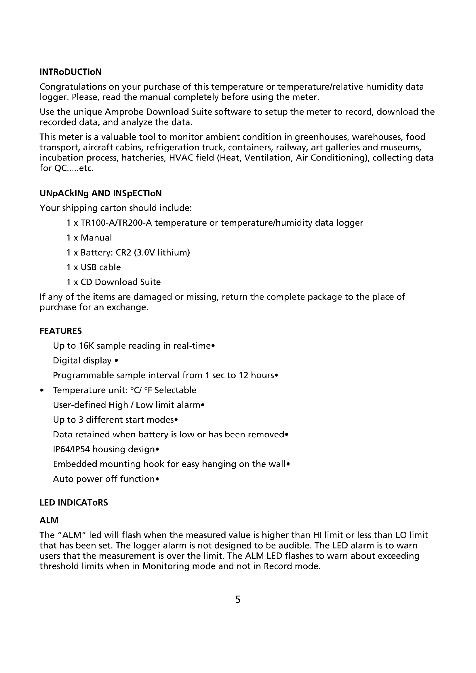 - AnvändarhandbokEnglish TR100-A / TR200-A Temperature / Humidity Data Loggers Users Manual TR100-A_200-A_Rev002 © 2009 Amprobe Test Tools. All rights reserved.2 Limited Warranty and Limitation of Liability Your Amprobe product will be free from defects in material and workmanship for 1 year from the date of purchase. This warranty does not cover fuses, disposable batteries or damage from accident, neglect, misuse, alteration, contamination, or abnormal conditions of operation or handling. Resellers are not authorized to extend any other warranty on Amprobe’s behalf. To obtain service during the warranty period, return the product with proof of purchase to an authorized Amprobe Test Tools Service Center or to an Amprobe dealer or distributor. See Repair Section for details. THIS WARRANTY IS YOUR ONLY REMEDY. ALL OTHER WARRANTIES - WHETHER EXPRESS, IMPLIED OR STAUTORY - INCLUDING IMPLIED WARRANTIES OF FITNESS FOR A PARTICULAR PURPOSE OR MERCHANTABILITY, ARE HEREBY DISCLAIMED. MANUFACTURER SHALL NOT BE LIABLE FOR ANY SPECIAL, INDIRECT, INCIDENTAL OR CONSEQUENTIAL DAMAGES OR LOSSES, ARISING FROM ANY CAUSE OR THEORY. Since some states or countries do not allow the exclusion or limitation of an implied warranty or of incidental or consequential damages, this limitation of liability may not apply to you. Repair All test tools returned for warranty or non-warranty repair or for calibration should be accompanied by the following: your name, company’s name, address, telephone number, and proof of purchase. Additionally, please include a brief description of the problem or the service requested and include the test leads with the meter. Non-warranty repair or replacement charges should be remitted in the form of a check, a money order, credit card with expiration date, or a purchase order made payable to Amprobe® Test Tools. In-Warranty Repairs and Replacement – All Countries Please read the warranty statement and check your battery before requesting repair. During the warranty period any defective test tool can be returned to your Amprobe® Test Tools distributor for an exchange for the same or like product. Please check the “Where to Buy” section on www. amprobe.com for a list of distributors near you. Additionally, in the United States and Canada In- Warranty repair and replacement units can also be sent to a Amprobe® Test Tools Service Center (see address below). Non-Warranty Repairs and Replacement – US and Canada Non-warranty repairs in the United States and Canada should be sent to a Amprobe® Test Tools Service Center. Call Amprobe® Test Tools or inquire at your point of purchase for current repair and replacement rates. In USA In Canada Amprobe Test Tools Amprobe Test Tools Everett, WA 98203 Mississauga, ON L4Z 1X9 Tel: 877-AMPROBE (267-7623) Tel: 905-890-7600 Non-Warranty Repairs and Replacement – Europe European non-warranty units can be replaced by your Amprobe® Test Tools distributor for a nominal charge. Please check the “Where to Buy” section on www.amprobe.com for a list of distributors near you. European Correspondence Address* Amprobe