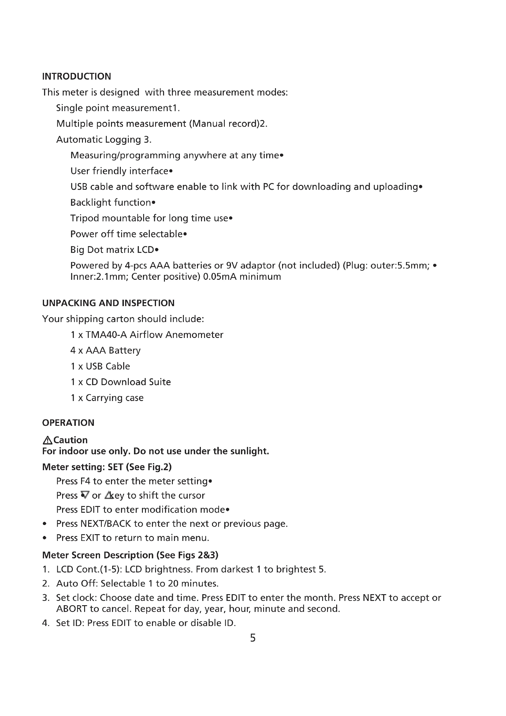 Your shipping carton should include: 1 x TMA40-A Airflow Anemometer 4 x AAA Battery 1 x USB Cable 1 x CD Download Suite 1 x Carrying case OPERATION Meter setting: SET (See Fig.2) Press F4 to enter the meter setting• Press • or key to shift the cursor Press EDIT to enter modification mode• Press NEXT/BACK to enter the next or previous page.• Press EXIT to return to main menu.• Meter Screen Description (See Figs 2&3) LCD Cont.(1-5): LCD brightness. From darkest 1 to brightest 5.1. Auto Off: Selectable 1 to 20 minutes. 2. Set clock: Choose date and time. Press EDIT to enter the month. Press NEXT to accept or 3. ABORT to cancel. Repeat for day, year, hour, minute and second. Set ID: Press EDIT to enable or disable ID.4. Caution For indoor use only. Do not use under the sunlight.6 ID: Press EDIT to enter the user id. Use the keypad to enter the information.5. Note: To calculate air volume, first enter the value of the air source area. Three choices are available: length X width (rectangle); Diameter(Circle); and Area. Range from 0~300cm (Rectangle and Circle and 0~90000sq.cm for area. Single Measurement: MEAS (See Fig. 3) Press F1 to enter the single measurement mode.• Press F2 to select the type of input• Press ESC to return to previous menu• Multiple Measurement: MEM (See Fig. 4) In this mode, you can manually record what you measure in real time and attach a file name with the recording. There is a total of 99 memory locations in this mode. Press F2 to enter the multiple measurement mode.• Press F2(MEAS) to start a measurement.• Press ABORT(F1) to cancel the measurement .• Press SAVE(F4) to save the recording.• Press F3(EDIT) to edit the file name of the recorded value. Use the keys to enter the name. • Press and hold to move from one character to another. Release the key to select the desired character. Press CLR(F2) to delete a selected character.• Press and hold CLR(F2) for over 2 seconds to delete the whole memory.• Automatic Logging: LOG (See Fig. 5) In this mode, you can automatically record what you have set up before a real time measurement. Press F3(LOG) to enter the LOG mode.• Press SET(F3) to set up the parameters for the recording.• Press • keys to select a parameter. Press EDIT to modify begin date, start time, End date, suspend time, and the rate ( 1 to 200 • seconds). Expect is 2400 points(total memory) and remain (remaining memory) will be calculated • according to your setting. Press NEXT• Press START to begin the logging session• Press VIEW to see the recording data• Press MEAS to see the real time data measurement.• Press ESC to return to previous screen.• Press STOP to suspend the logging session.•7 Press NEXT• Press P-PG(previous page) or N-PG (next page) to see the previous or the next 100 points.• Press BACK• Press EXIT to return to the main screen• COMPARISON TABLE Measurement Description Memory Point Single point Single point measurement No Memory Multi-Point File name editable Multi-point measurement 99 points Automatic Logging Programmable Data logging function 2400 points Multi-point measurement Data Logging Record 99 points 2400 points File Name Editable or Default with date and time (Note 1) Default (Note 2) Measuring/Sampling Press MEAS Key to measure and store Automatically measure and store according to preset parameters (Note 3) Note 1: The recording file name will show current date and time as file name if the user doesn’t edit any. Example: ”05-06 09:21:51” means the recording was made on May 6th at 09:21:51 or June 5th at 09:21:51 depending on your date mode setting. Note 2: Each recording file will take the current date and time as file name. Note 3: The meter will start and stop recording at the preset dates and times. If the preset time is less than 24-hour and the end date is in the future, the meter will stop at the ending time and restart again the next day until the ending date or until the memory is full. a) Set the date and start time b) Set the date and stop time c) Set the sample rate d) In order to record 24-hour a day, you must set START for 00:00:00 and SUSPEND for 23:59:598 TECHNICAL SPECIFICATIONS Temperature resolution 0.1°C (0.1°F) Temperature response 30 seconds Relative Humidity range 0 to 100% RH accuracy ± 3% at 10% to 99%; ± 5% at all others RH resolution 0.1% RH response time 15 seconds Wet Bulb range -22 to 70°C (-7.6°F to 158°F) Wet Bulb resolution 0.1 Air Velocity range 0.4 to 32 m/s ( 1.3 to 105 ft/s) Air Velocity accuracy ± 3% Air Velocity Resolution 0.1 m/s (0.1 ft/s) Air Velocity response time 1 second Air Volume range 0 to 99999 (CFM or CMM) Air Volume accuracy ± 3% Air Volume resolution 0.1 Measurement with memory 99 points Datalogging measurement 2400 points Dimensions 165 X 70 X 53 mm ( 6.5 X 2.57 X 2.1 in) SOFTWARE OPERATION9 -Insert the software CD into CD-ROM driver -Install the USB driver first -Install the software follow the on-screen instructions -Open the program -Click the “Port” from main screen and input the right comm. port. -Click as follow to download the memory Click to download manually recorded data.1. Click to download automatically recorded data2. Click to download both manually & automatically recorded data3. TROUBLESHOOTING Power on but no display Make sure the time of pressing ”ON/OFF” key is more than 0.2 seconds.• Check the batteries are in place and make sure they are at good contact and correct polarity.• Replace the batteries and try again .• Display disappear Check whether the low battery indicator is displayed on or before display disappears. If yes, • replace the batteries . Error code: E2. Problem : Meter value is underflow .• E3. Problem : Meter value is overflow.• E4. Problem: Calculated source value occurs error.•10 F1 F2