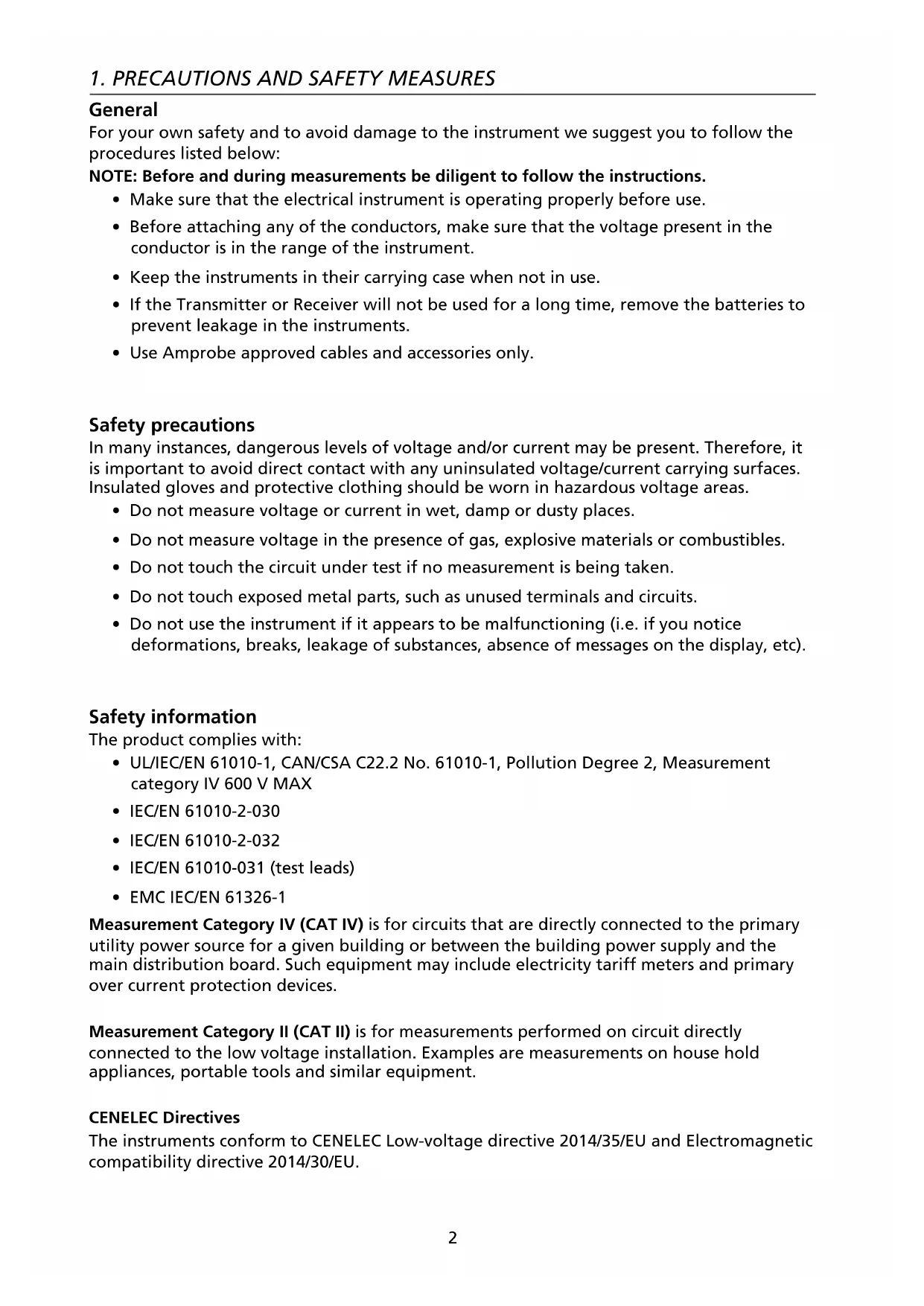 - EMC IEC/EN 61326-1 Measurement Category IV (CAT IV) is for circuits that are directly connected to the primary utility power source for a given building or between the building power supply and the main distribution board. Such equipment may include electricity tariff meters and primary over current protection devices. Measurement Category II (CAT II) is for measurements performed on circuit directly connected to the low voltage installation. Examples are measurements on house hold appliances, portable tools and similar equipment. CENELEC Directives The instruments conform to CENELEC Low-voltage directive 2014/35/EU and Electromagnetic compatibility directive 2014/30/EU.3 Warnings: Read Before Using To avoid the possibility of electric shock or personal injury: