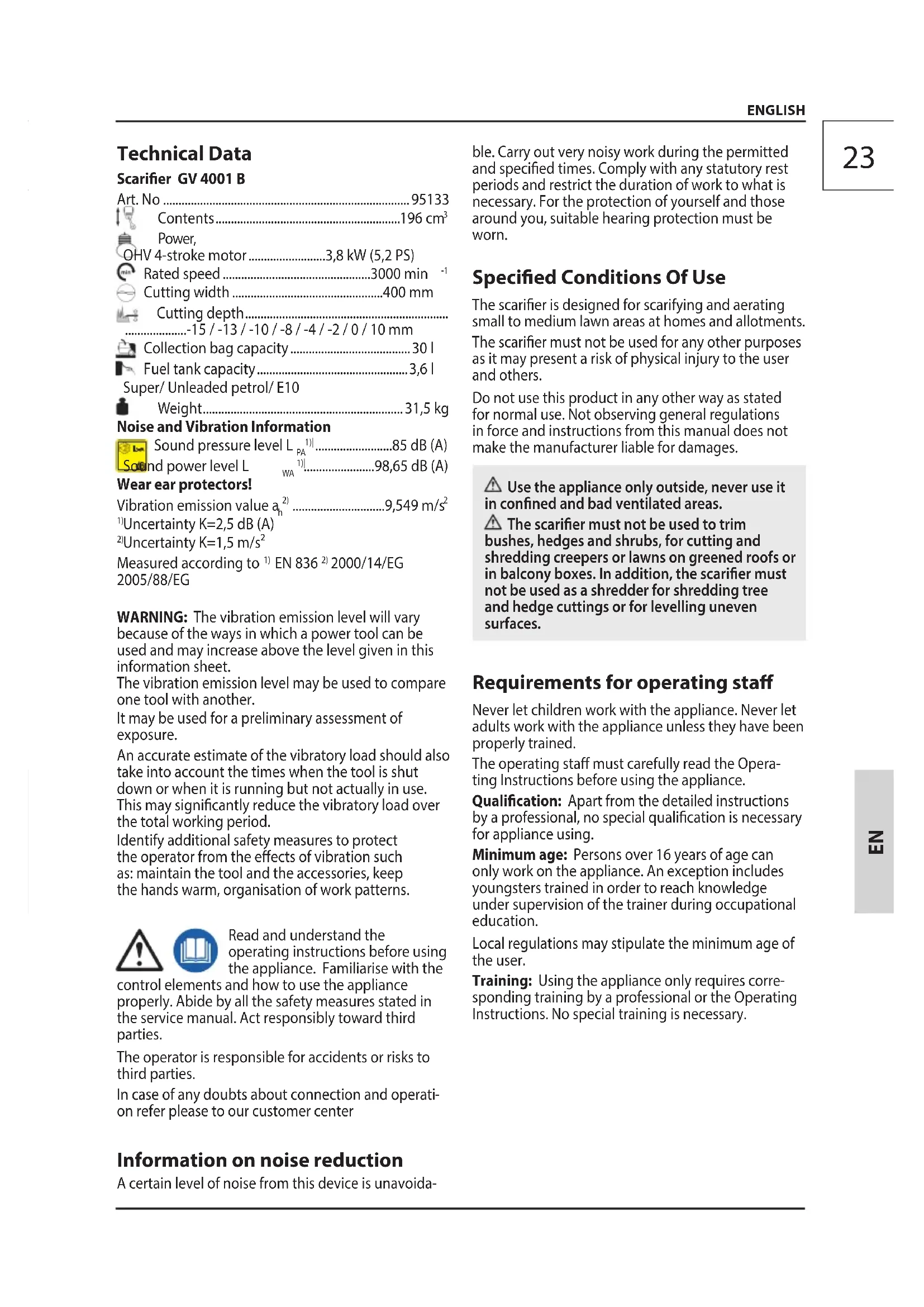 because of the ways in which a power tool can be used and may increase above the level given in this information sheet. The vibration emission level may be used to compare one tool with another. It may be used for a preliminary assessment of exposure. An accurate estimate of the vibratory load shouldalso take into account the times when the tool isshut down or when it is running but not actually inuse. This may signicantly reduce the vibratoryload over the total working period. Identify additional safety measures to protect theoperator from the eects of vibration such as:maintain the tool and the accessories, keep thehands warm, organisation of work patterns. Read and understand the operating instructions before using the appliance. Familiarise with the control elements and how to use the appliance properly. Abide by all the safety measures stated in the service manual. Act responsibly toward third parties. The operator is responsible for accidents or risks to third parties. In case of any doubts about connection and operati