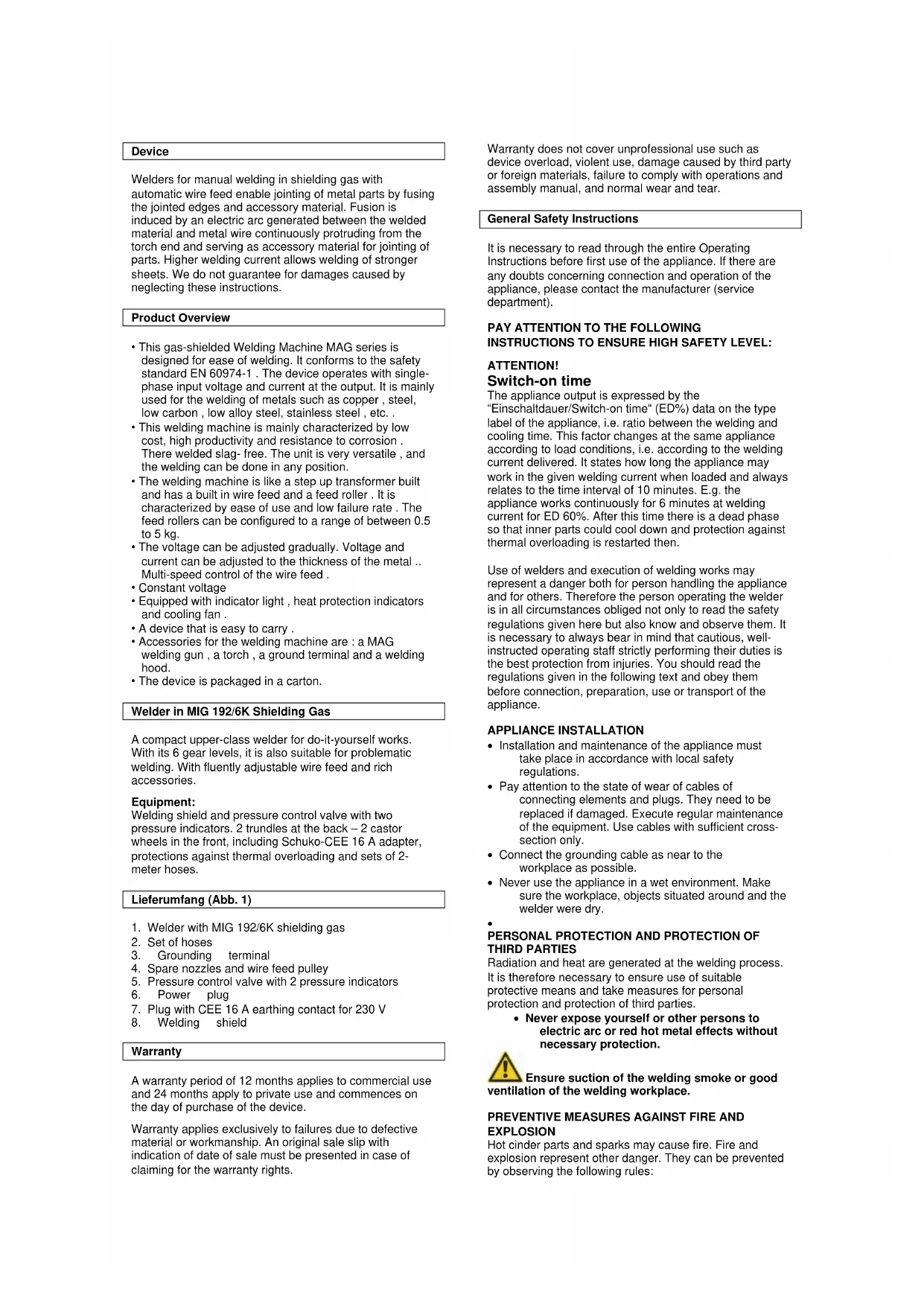 • The device is packaged in a carton. Welder in MIG 192/6K Shielding Gas A compact upper-class welder for do-it-yourself works. With its 6 gear levels, it is also suitable for problematic welding. With fluently adjustable wire feed and rich accessories. Equipment: Welding shield and pressure control valve with two pressure indicators. 2 trundles at the back – 2 castor wheels in the front, including Schuko-CEE 16 A adapter, protections against thermal overloading and sets of 2- meter hoses. Lieferumfang (Abb. 1)