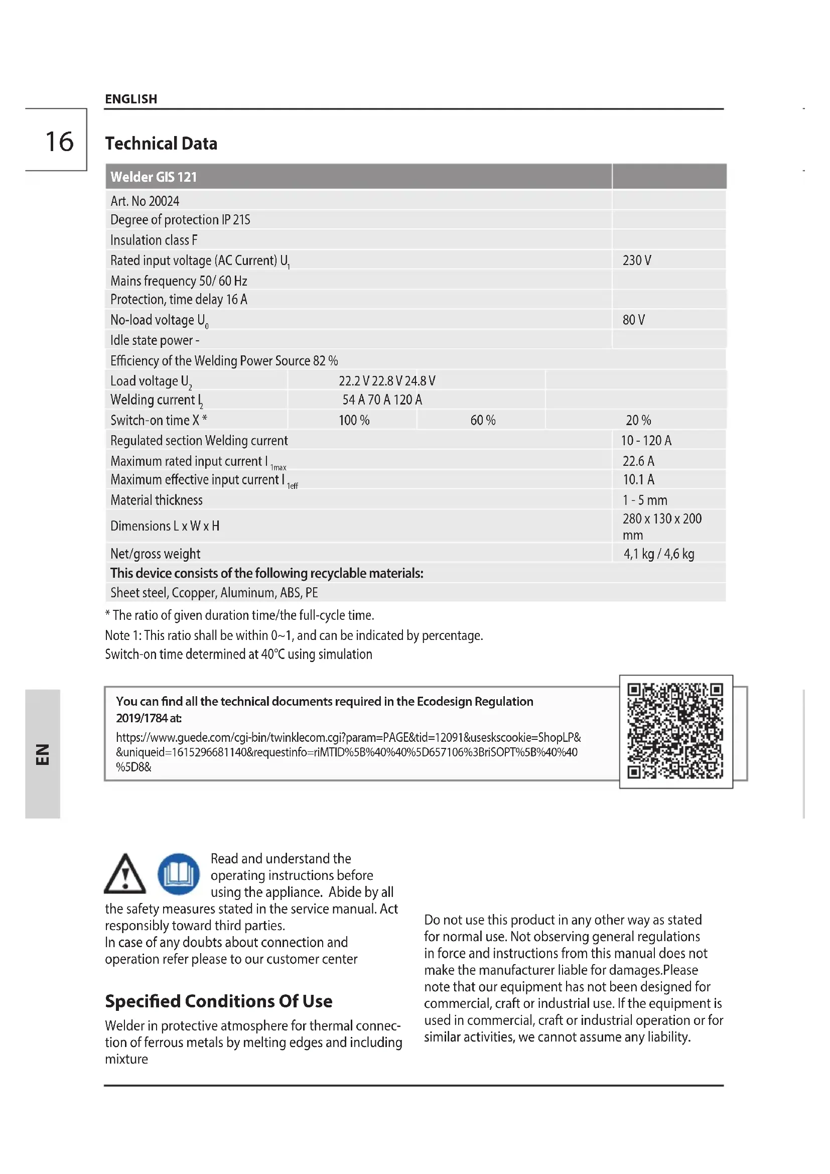 Do not use this product in any other way as stated for normal use. Not observing general regulations in force and instructions from this manual does not make the manufacturer liable for damages.Please note that our equipment has not been designed for commercial, craft or industrial use. If the equipment is used in commercial, craft or industrial operation or for similar activities, we cannot assume any liability. Read and understand the operating instructions before using the appliance. Abide by all the safety measures stated in the service manual. Act responsibly toward third parties. In case of any doubts about connection and operation refer please to our customer center Specied Conditions Of Use Welder in protective atmosphere for thermal connec- tion of ferrous metals by melting edges and including mixture ENGLISH Technical Data Welder GIS 121 Art. No 20024 Degree of protection IP 21S Insulation class F Rated input voltage (AC Current) U