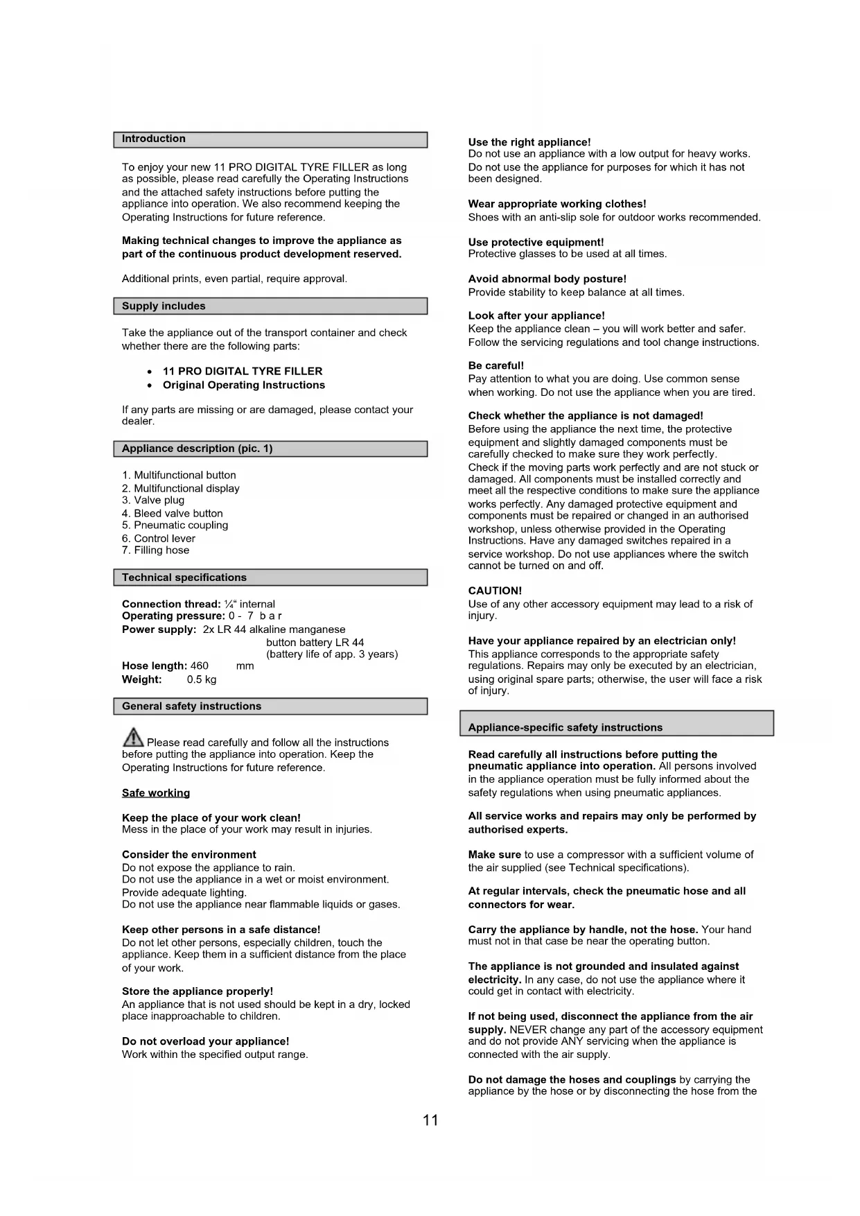 Technical specifications Connection thread: ¼“ internal Operating pressure: 0- 7 bar Power supply: 2x LR 44 alkaline manganese button battery LR 44 (battery life of app. 3 years) Hose length: 460 mm Weight: 0.5 kg General safety instructions Please read carefully and follow all the instructions before putting the appliance into operation. Keep the Operating Instructions for future reference. Safe working Keep the place of your work clean! Mess in the place of your work may result in injuries. Consider the environment Do not expose the appliance to rain. Do not use the appliance in a wet or moist environment. Provide adequate lighting. Do not use the appliance near flammable liquids or gases. Keep other persons in a safe distance! Do not let other persons, especially children, touch the appliance. Keep them in a sufficient distance from the place of your work. Store the appliance properly! An appliance that is not used should be kept in a dry, locked place inapproachable to children. Do not overload your appliance! Work within the specified output range. Use the right appliance! Do not use an appliance with a low output for heavy works. Do not use the appliance for purposes for which it has not been designed. Wear appropriate working clothes! Shoes with an anti-slip sole for outdoor works recommended. Use protective equipment! Protective glasses to be used at all times. Avoid abnormal body posture! Provide stability to keep balance at all times. Look after your appliance! Keep the appliance clean – you will work better and safer. Follow the servicing regulations and tool change instructions. Be careful! Pay attention to what you are doing. Use common sense when working. Do not use the appliance when you are tired. Check whether the appliance is not damaged! Before using the appliance the next time, the protective equipment and slightly damaged components must be carefully checked to make sure they work perfectly. Check if the moving parts work perfectly and are not stuck or damaged. All components must be installed correctly and meet all the respective conditions to make sure the appliance works perfectly. Any damaged protective equipment and components must be repaired or changed in an authorised workshop, unless otherwise provided in the Operating Instructions. Have any damaged switches repaired in a service workshop. Do not use appliances where the switch cannot be turned on and off. CAUTION! Use of any other accessory equipment may lead to a risk of injury. Have your appliance repaired by an electrician only! This appliance corresponds to the appropriate safety regulations. Repairs may only be executed by an electrician, using original spare parts; otherwise, the user will face a risk of injury. Appliance-specific safety instructions Read carefully all instructions before putting the pneumatic appliance into operation. All persons involved in the appliance operation must be fully informed about the safety regulations when using pneumatic appliances. All service works and repairs may only be performed by authorised experts. Make sure to use a compressor with a sufficient volume of the air supplied (see Technical specifications). At regular intervals, check the pneumatic hose and all connectors for wear. Carry the appliance by handle, not the hose. Your hand must not in that case be near the operating button. The appliance is not grounded and insulated against electricity. In any case, do not use the appliance where it could get in contact with electricity. If not being used, disconnect the appliance from the air supply. NEVER change any part of the accessory equipment and do not provide ANY servicing when the appliance is connected with the air supply. Do not damage the hoses and couplings by carrying the appliance by the hose or by disconnecting the hose from the 11air supply by pulling it. Make sure the hose does not get in touch with excess temperatures, oil and sharp edges. If damaged or worn out, the hose must be changed. The air pressure when operating the appliance MUST NOT be higher than 7 bar. Use a pressure regulator that will reduce the air pressure to 7 bar. Behave responsibly to other persons. Provide good stability. Follow the compressor operation instructions/regulations. Risk of explosion! Appliance not to be used in an explosion- risk environment. Maximum pressure to be adhered to. Compressed air to be used only. CAUTION! A whistling filling hose to be held when filling and discharging. Do not bend the filling hose. CAUTION! A whistling pneumatic hose to be held when opening the quick-acting coupling! ATTENTION! Risk of trip! Avoid or, to be more specific, pay attention to pneumatic hoses leading over floor! Safe working is only possible when you are relaxed and concentrated. Protect yourself, other persons, animals, items and the environment by taking the necessary protective measures, training in operating the appliance and preventive measures that will avoid actual bodily harm, property and environment damage and accidents. Any repairs may only be executed by the manufacturer or authorised service partners of the manufacturer. Prohibitions: Handling; use in conflict with the designation; emergency repairs; other sources of energy; safety equipment removal or damage; use in case of leak or operating failures; no original spare parts; exceeding the given allowed operating pressure; work without protective equipment; transport of appliance under pressure, servicing, repairs, leaving the appliance unattended; use of different/incorrect lubrication; smoking; open fire; removal of sticky labels. Never aim with the air flow at persons, animals, electrical parts and yourself. Explanation of symbols The following symbols are used in these Operating Instructions and/or on the appliance: Product safety: Product corresponds to appropriate EU standards Prohibitions: Protect against rain, moisture and climatic influences! Not to be fallen into hands of children